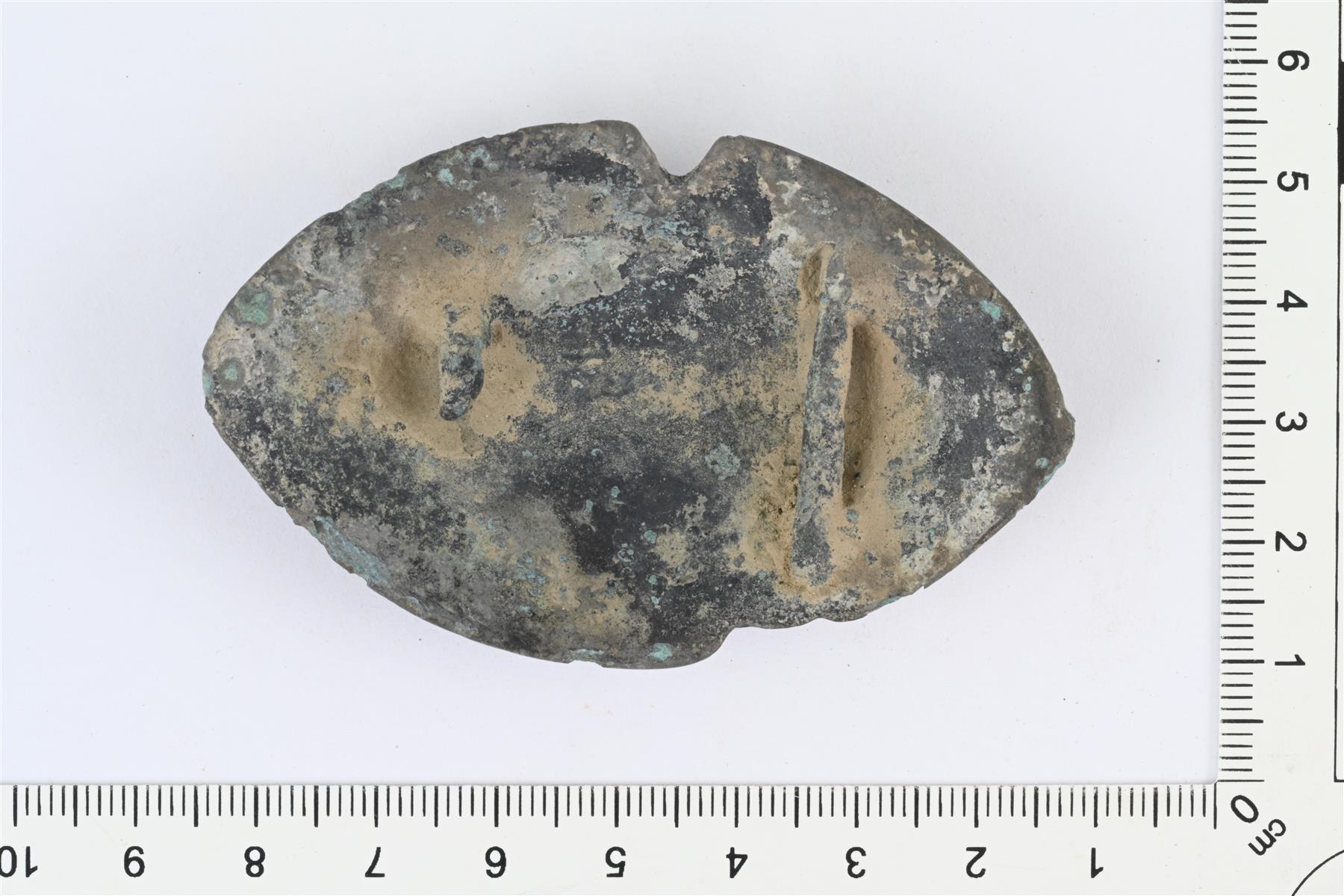 | Soikea kupurasolki. Neula puuttuu, muuten ehjä. Muoto päihin suippeneva. Reunoissa lovia, jotka murtumia tai mahdollisesti valuvirheitä. Vastaa Ailion (1922) tyyppiä D (akantussolki), koristelussa naamakuvioita ja kiemuraisia kasvikuvioita. Kiinnitys Ailion tyyppiä cc1, jossa yksi poikkiorsi neulaa varten ja neulakota. | |