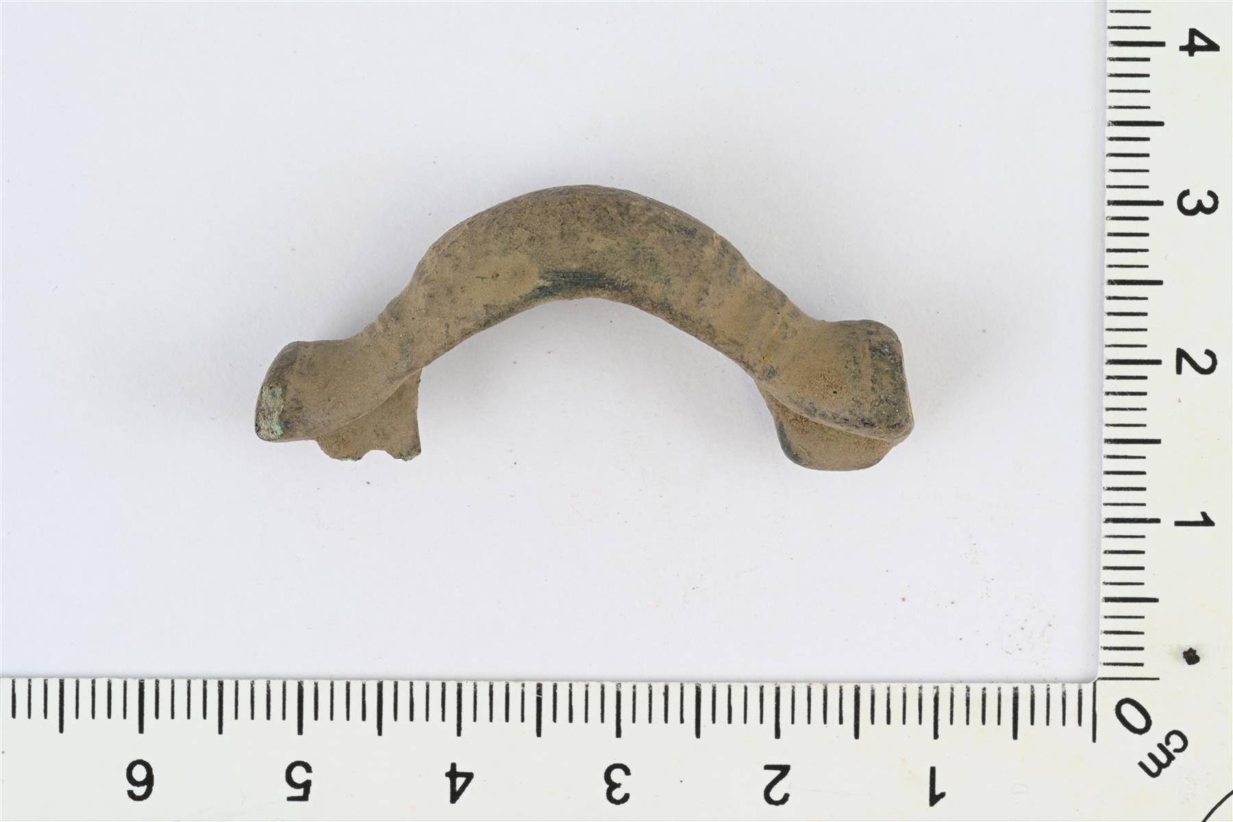 | Tasavartinen solki. Etupuolella päissä poikittaista viivakoristelua. Taustapuolella neulalaitteen jäännökset. | |
