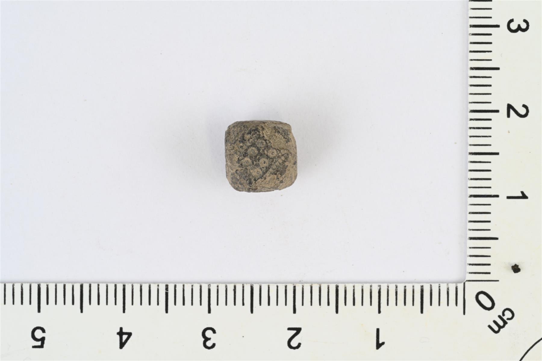 | Pieni monitahokkaan muotoinen punnus. Muodoltaan kuutio, jonka kulmat viistottu. Sivujen keskellä kuusi pientä häränsilmäleimaa kahdessa rivissä. | |
