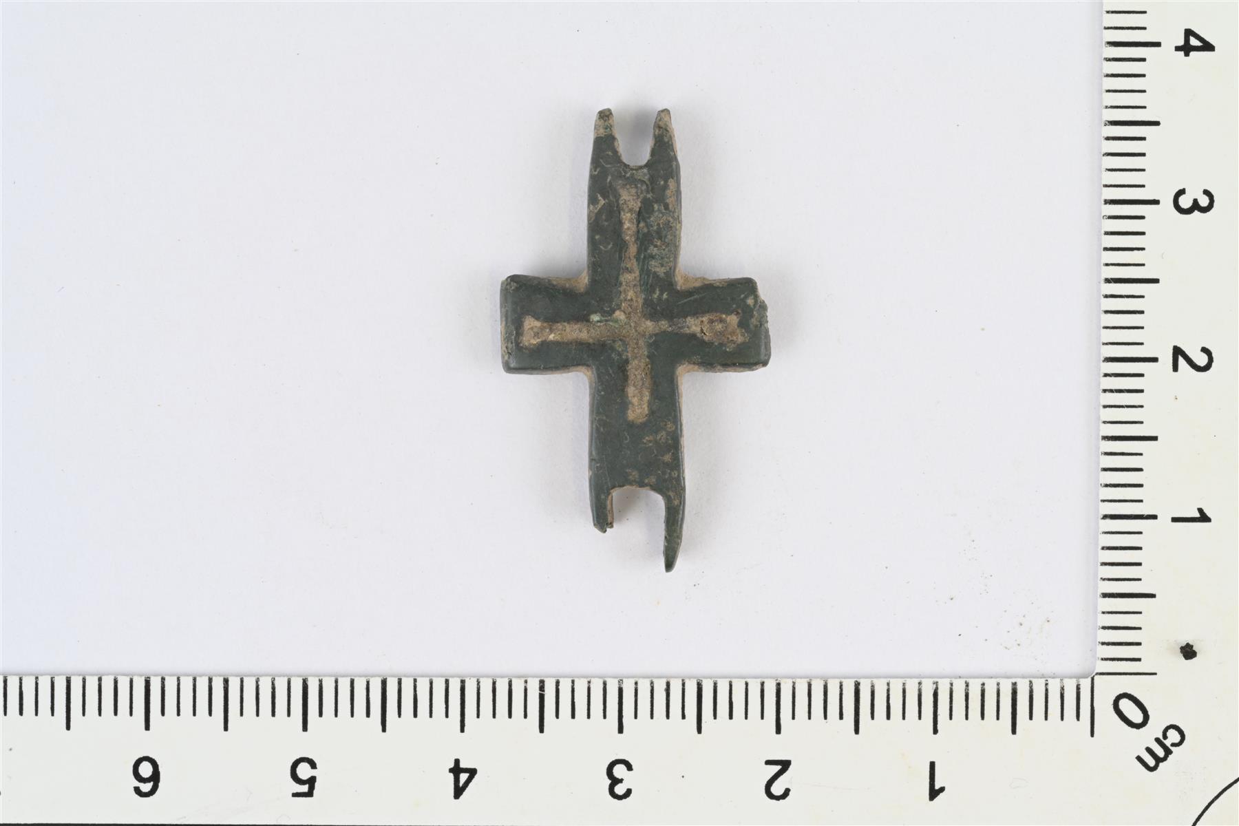 | Korun tai koristeen osa. Muodoltaan risti, jossa kaksi vastakkaista vartta pitkiä ja kaksi lyhyitä. Pitkien varsien päissä saranamaiset kiinnittimet, kaksi pientä levyä, joista yksi säilynyt ehjänä ja siinä pieni reikä. Taustapuoli kovera. Etupuoli tasainen ja siinä syvennyksenä risti. | |