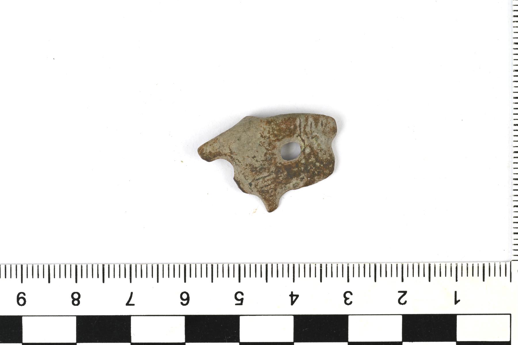 | Pyöreän kupurasoljen reunakatkelma. Kulunut melko sileäksi. Taustapuolella on neulan kiinnityslenkin jäänne. | |