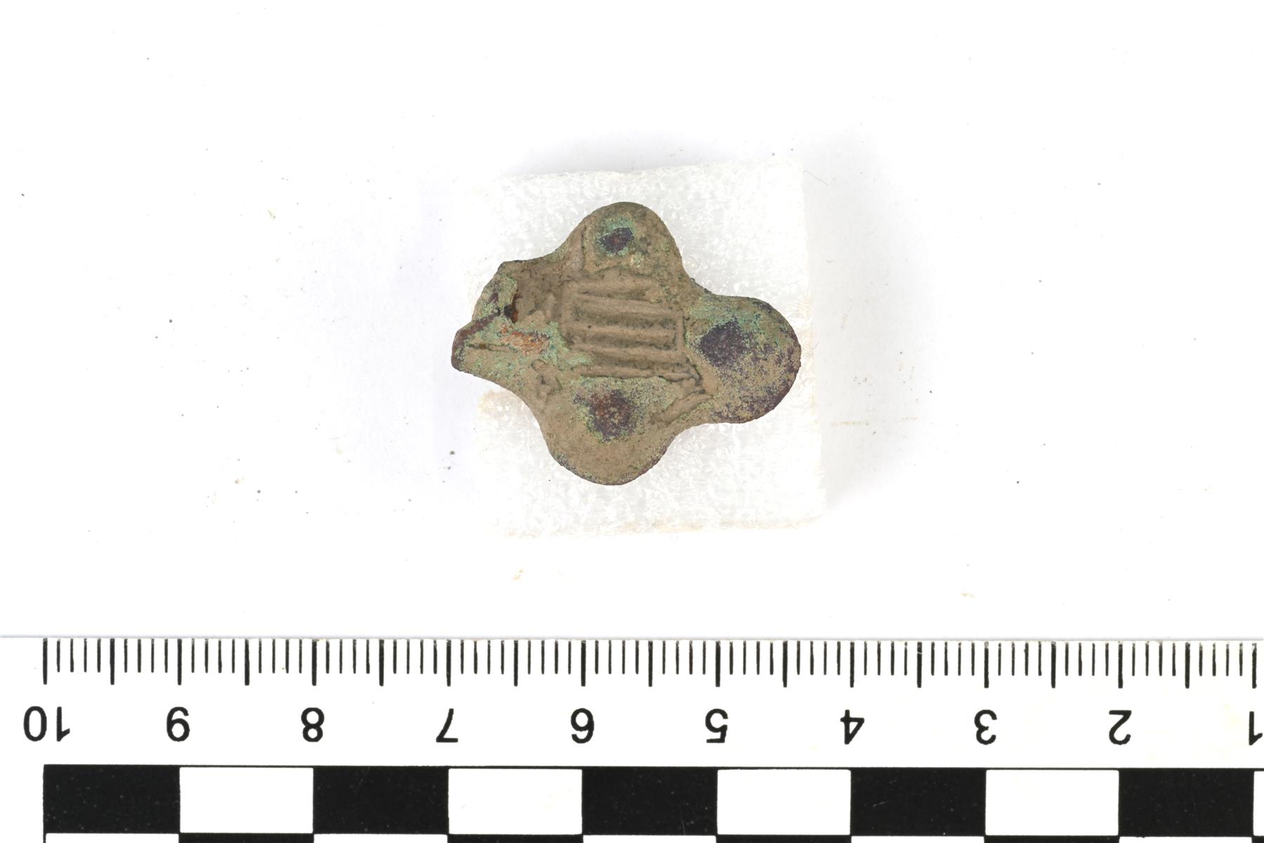 | Tyypin 8 tasavarsisoljen päätykatkelma. Koristeluna viivauurteita ja puolipallomaisia kohoumia. Taustapuolella neulakota. Vrt. Kivikoski Fig. 21. | |