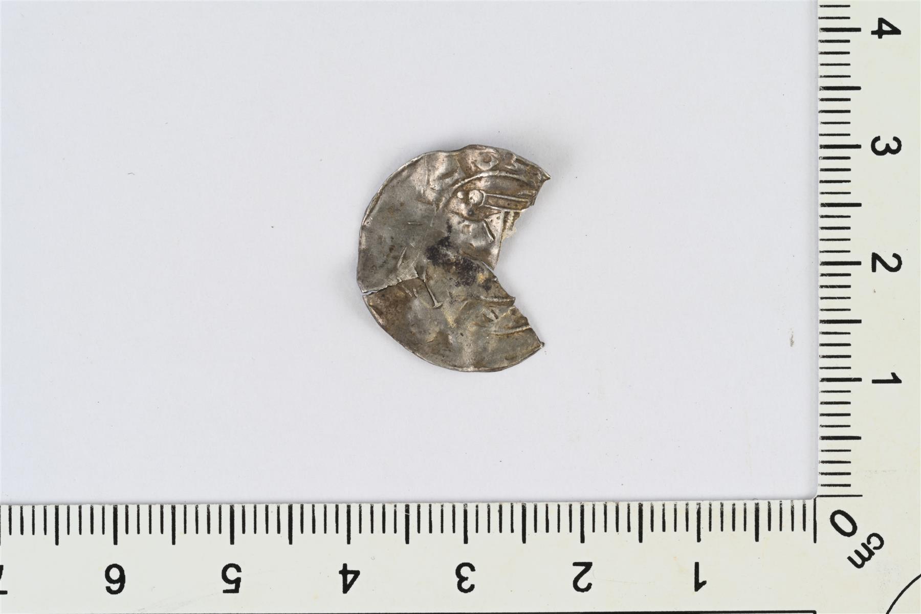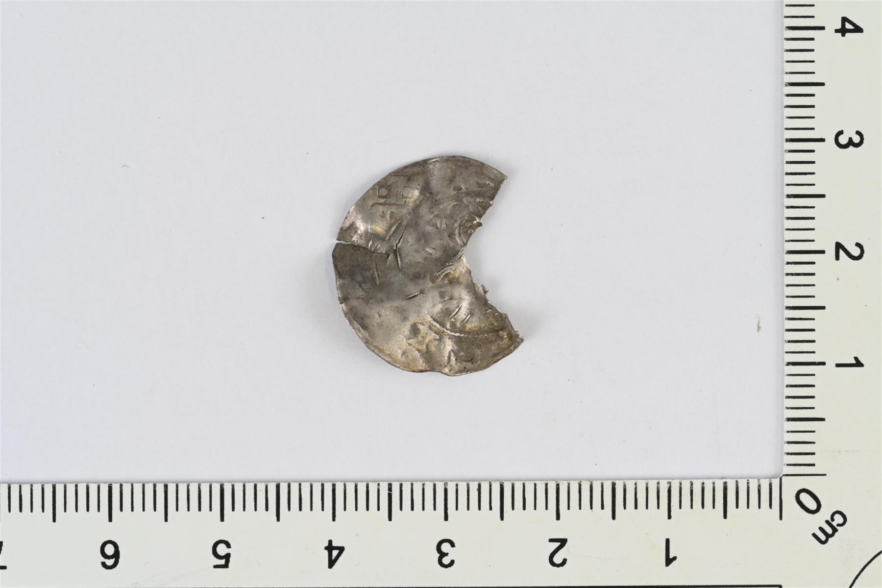 | Saksalainen penninki, Köln, lyöntivuosi n. 1057-75. Rahasta puuttuu noin ¼. Vaikuttaa olevan päällelyönti. Toisella puolen leima mennyt reippaasti aihion ohi ja toisella puolen erottuu mahdollisesti kaksi eri leimaa, joista toinen jatkuu aihion ulkopuolelle. Hävernick 338. Dbg. 399? | |