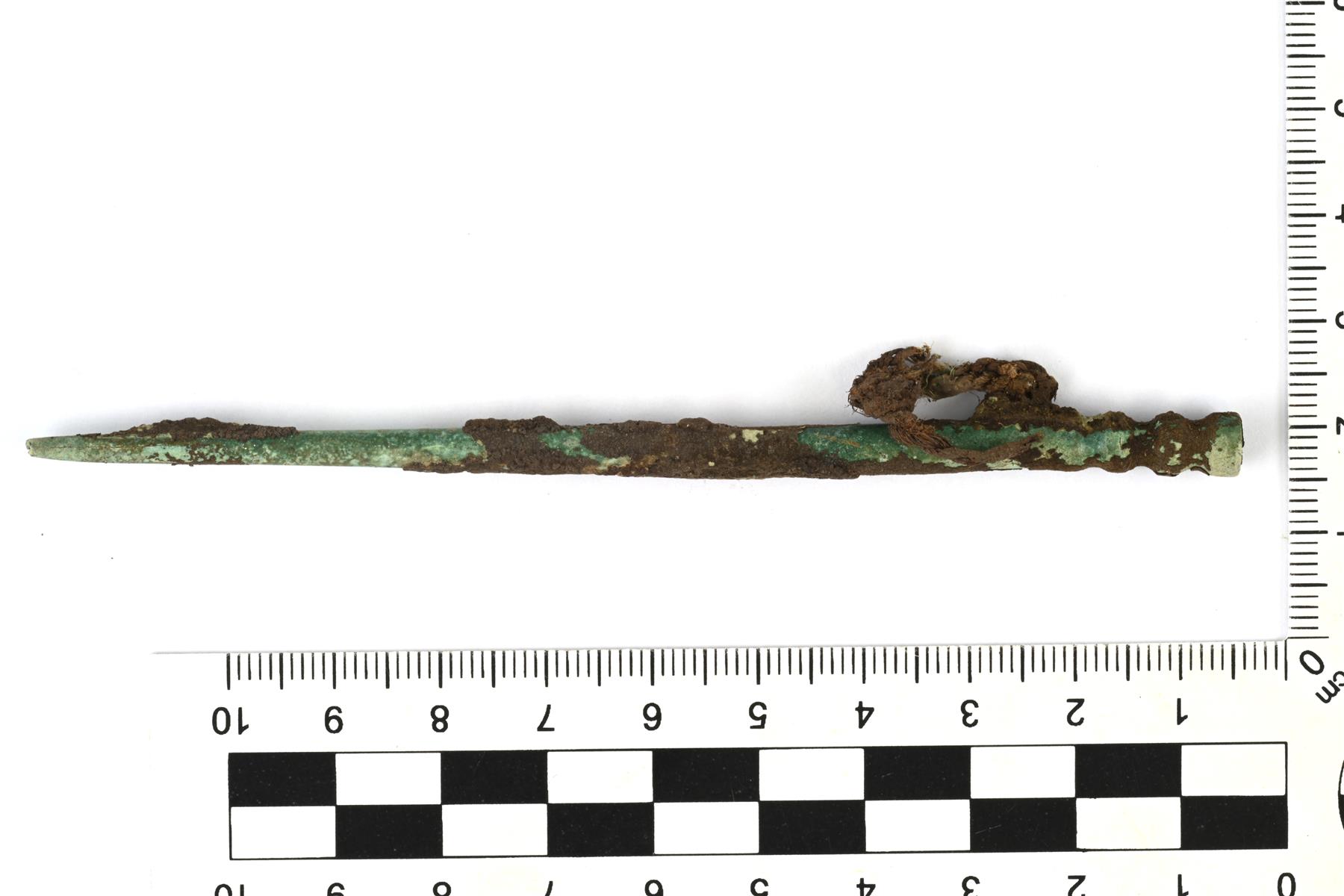 | Profiloitunuppinen koruneula. Neulan poikkileikkaus on pyöreä. Nupissa on kolme kiekkomaista levennystä ja näiden alapuolella on lenkki. Lenkissä on säilyneenä pieni pätkä nyöriä. Esinemuoto kuuluu Beckmannin ryhmään H (Abb. 1). Kuuluu samaan kokonaisuuteen kuin : 2 ja : 3. | |