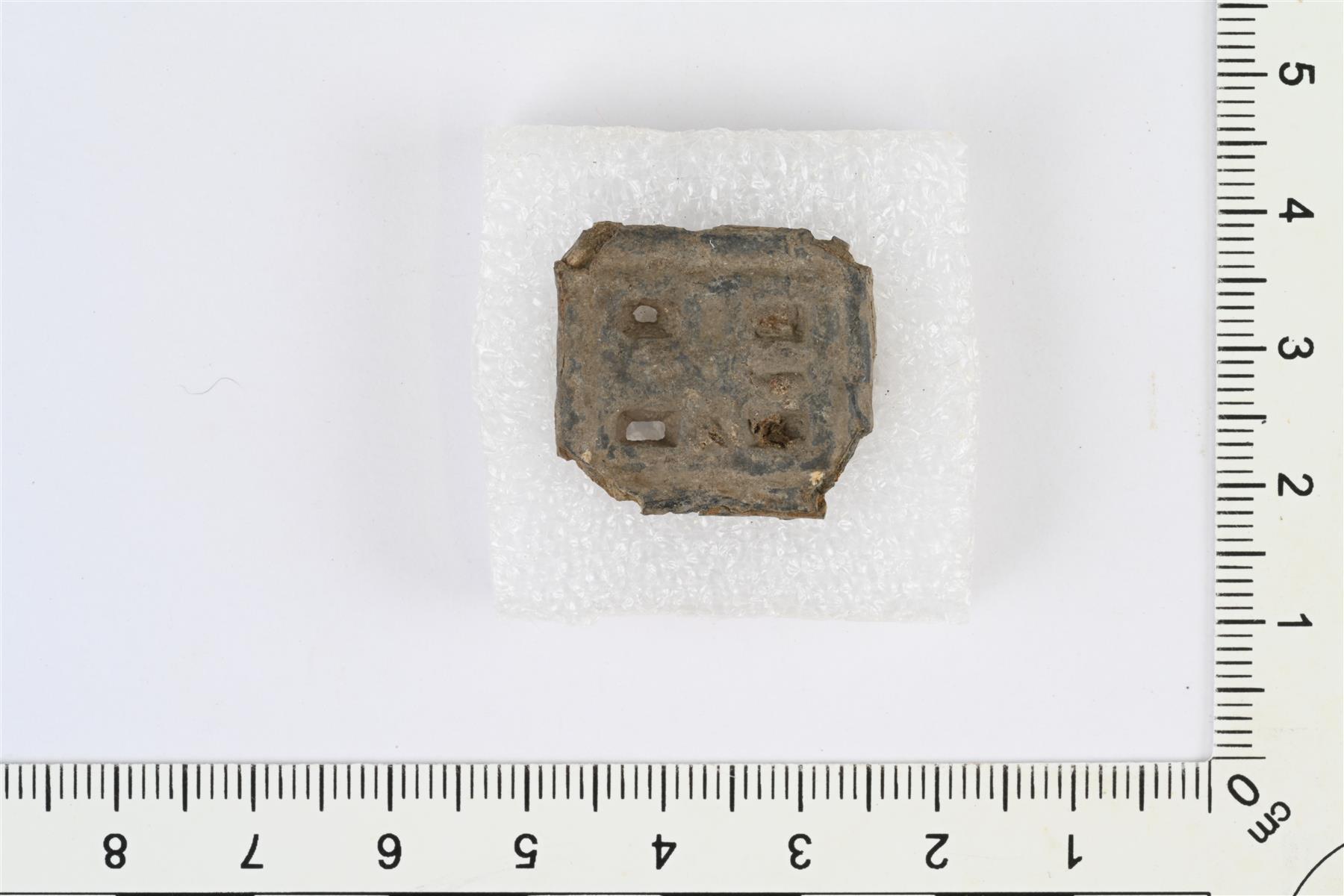 | Suorakaiteenmuotoinen hihnan tai vyön hela. Puhkonainen, leveä reunus ja keskellä risti, jonka varsien väliin jää reiät. Taustapuolella kaksi kiinnitystappia. | |