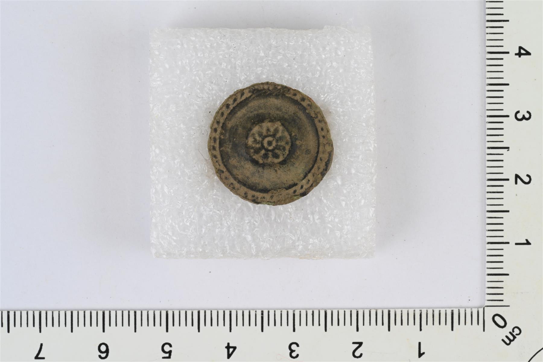 | Litteä hieman kovera nappi, ns. kansanpuvun nappi. Etupuolella reliefikoristelua, jossa helminauhareunus ja keskellä kukkakuvio. Taustapuolella kanta. | |