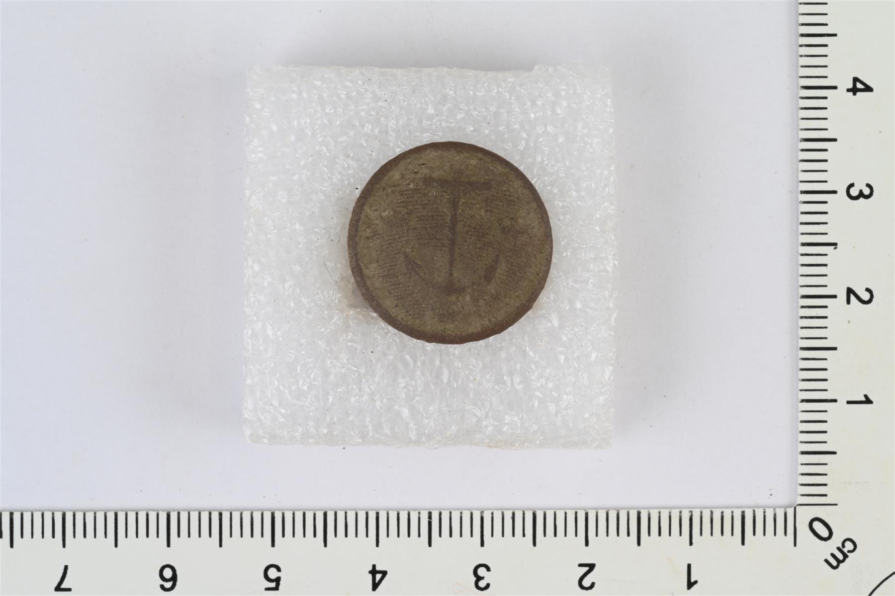 | Litteä nappi. Etupuolella koristeluna ankkuri ja taustalla tiheää kaarevaa poikkiviivoitusta. Taustapuolella kanta. | |