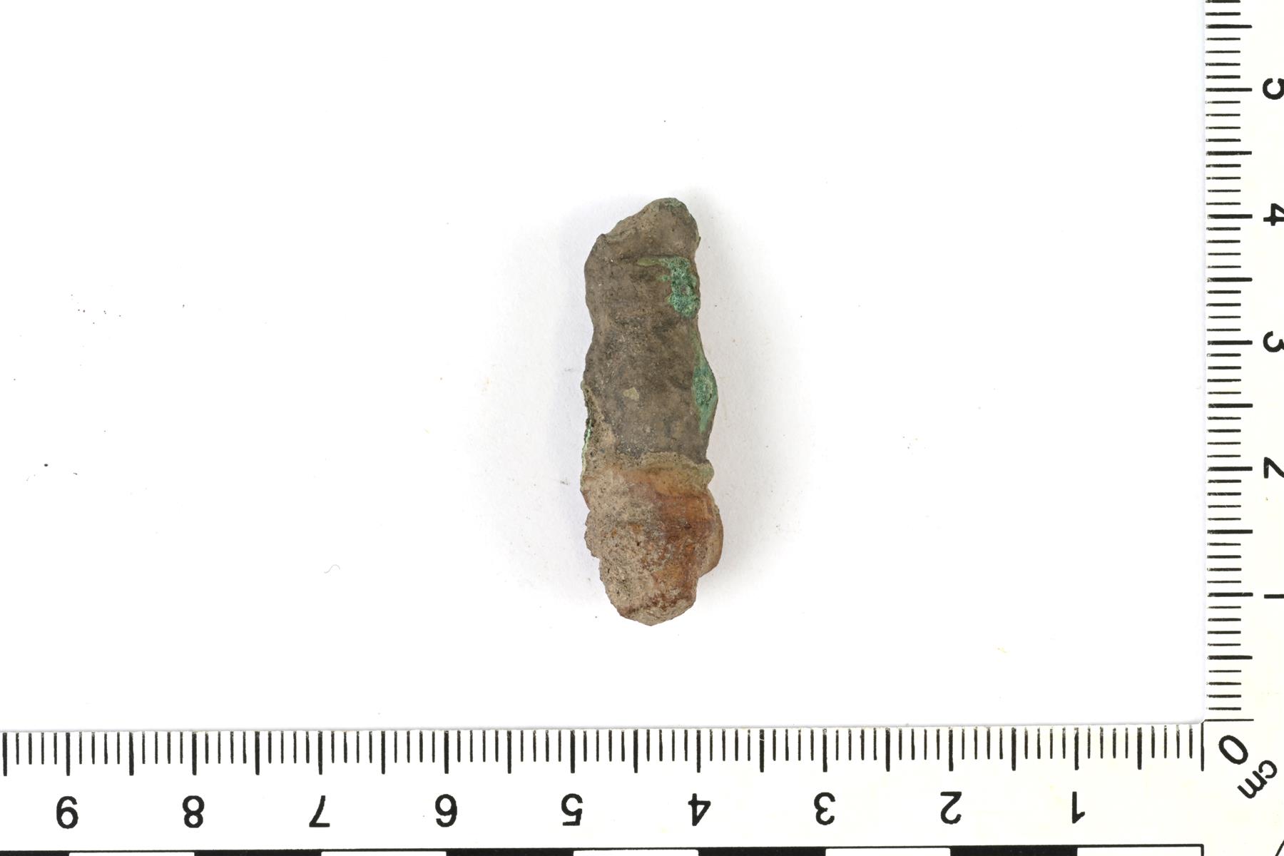 | Koruneulan nuppi. Sivuilla on säilyneenä valinsauma. Rautaisesta neulasta on jäljellä pieni jäänne. Vrt. Arbman Taf. 171: 6. | |