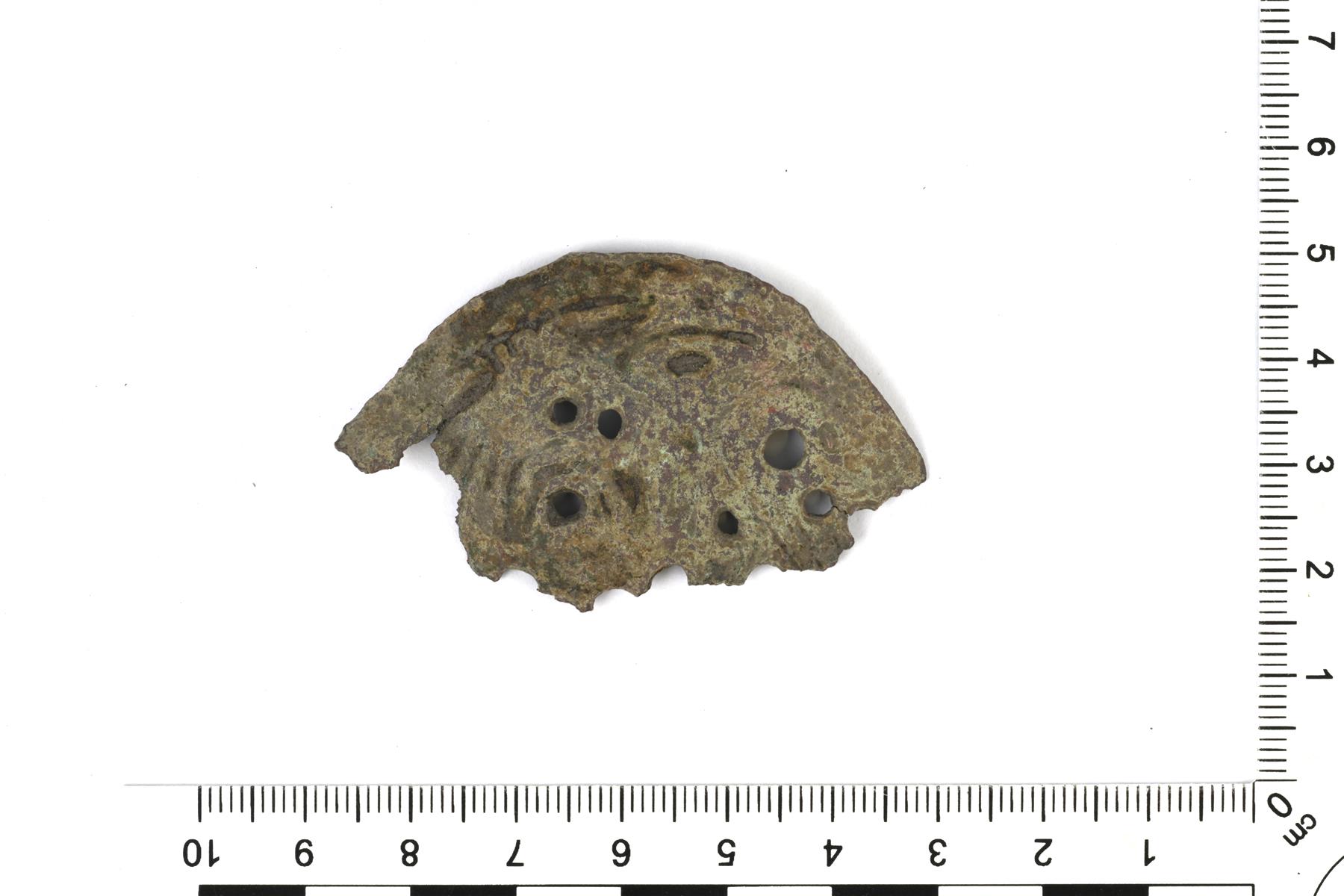 | Pinnalta pahoin kulunut pyöreä kupurasolki. Taustapuolen neulan kiinnityslenkki on hajonnut. | |