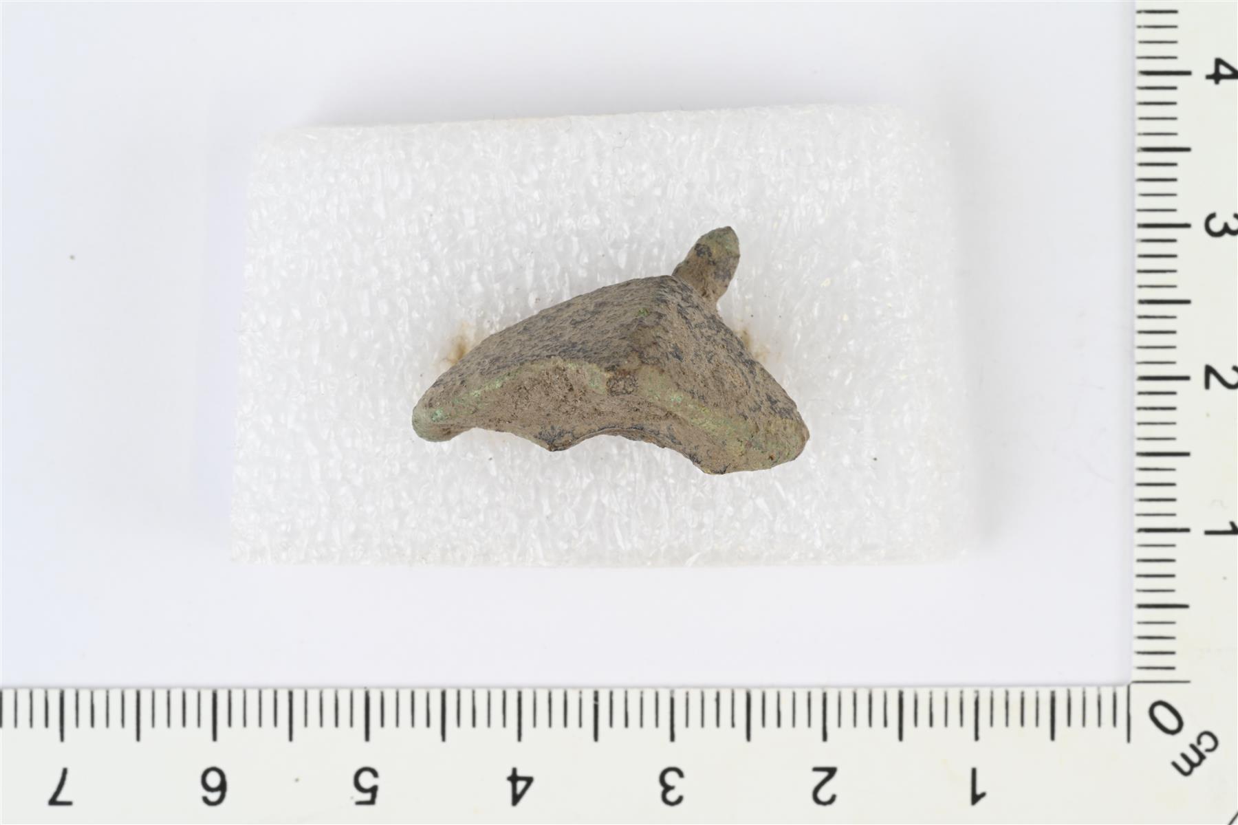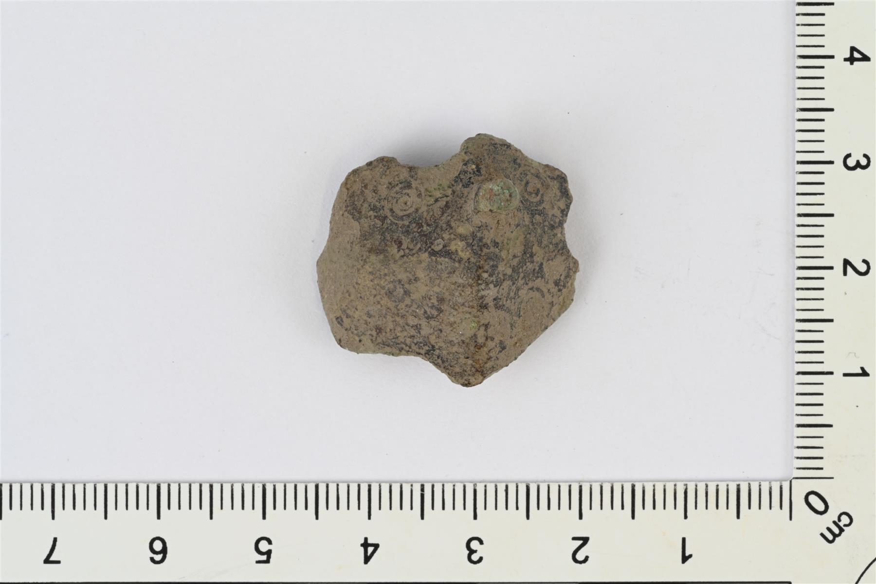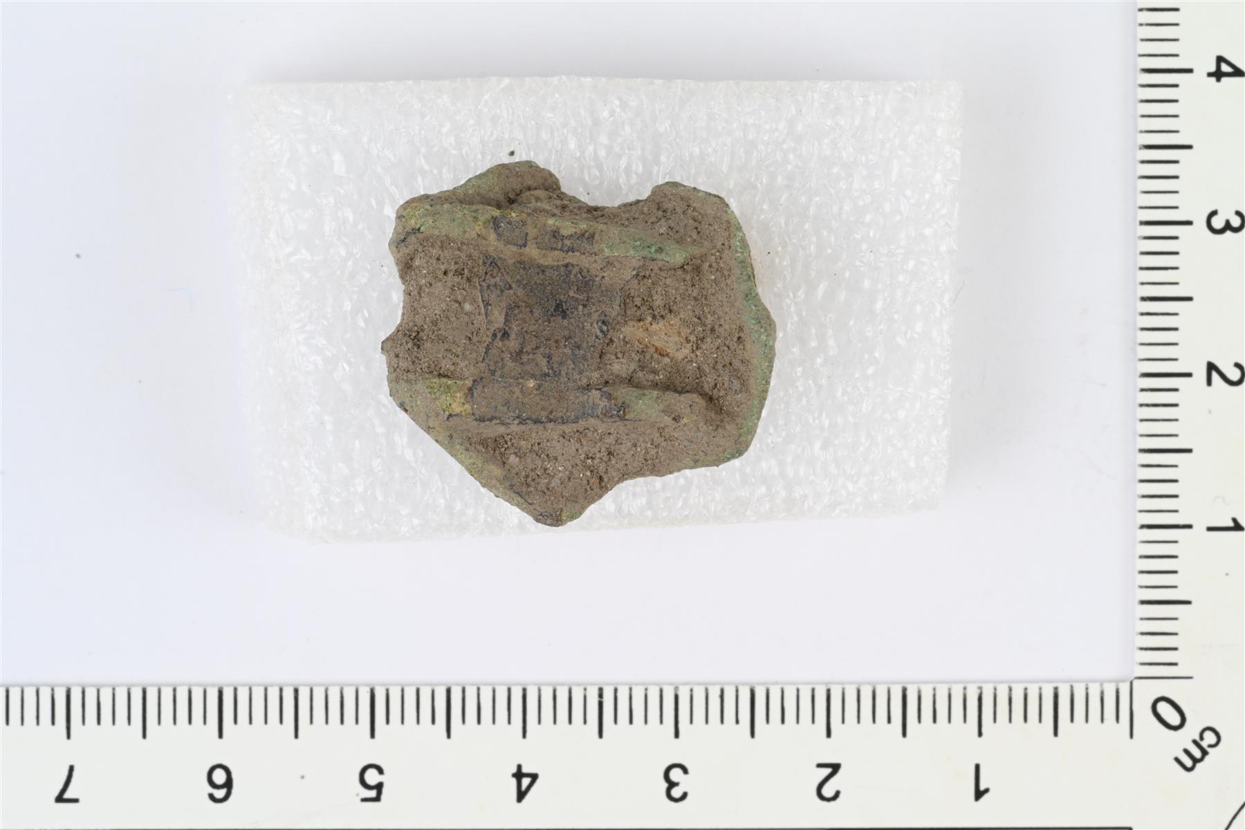 | Kupariseosesineen katkelma. Etupuoli harjava ja siinä yksi korkea tappi sekä häränsilmäleimoja. Taustapuolella kaksi kiskoa. | |