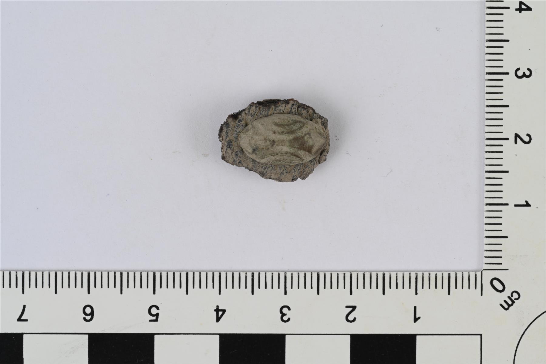 | Pieni ovaali hihnan- tai vyönhela. Etupuoli kupera ja siinä uurrekoristelua. Taustapuolella ohut kiinnitystappi, joka kiinni nahanpalassa. | |