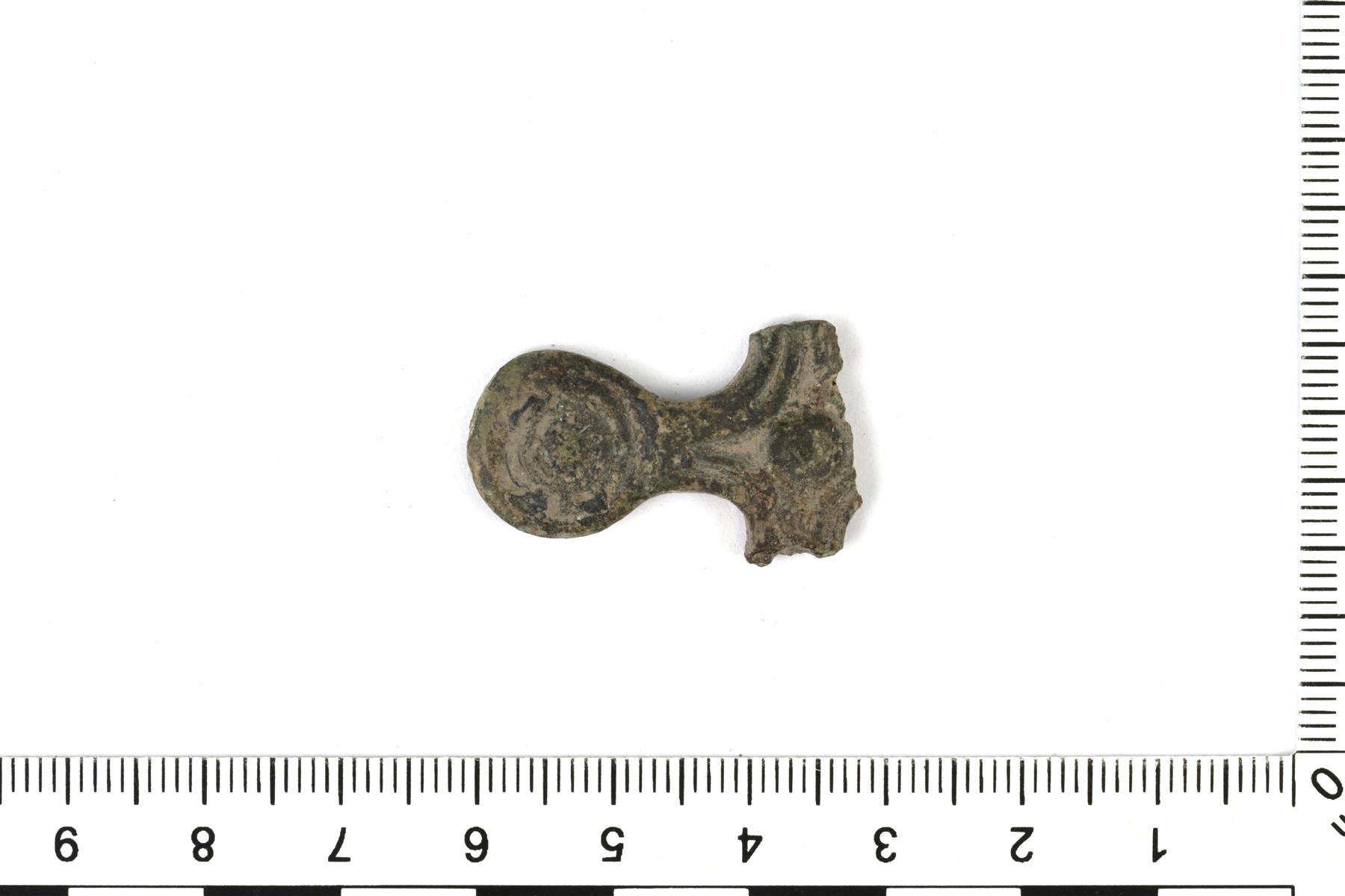 | Todennäköinen katkelma ristipäisestä neulasta. Koristeluna sisäkkäisiä kehiä ja keskellä viivauurteita. Vrt. Kivikoski Abb. 719 | |