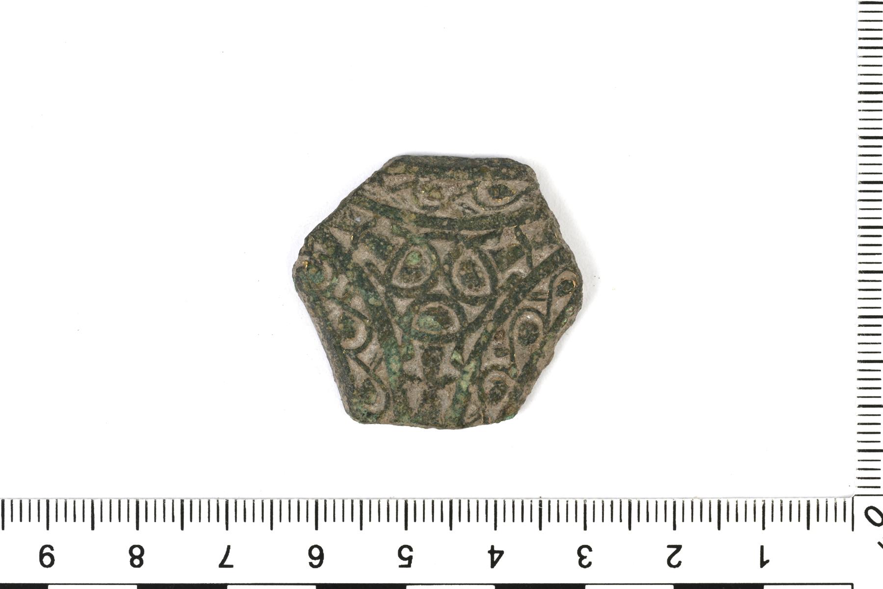 | Nauhamaisella kasviornamentiikkakuviolla koristeltu kupariseoslevyn katkelma. | |