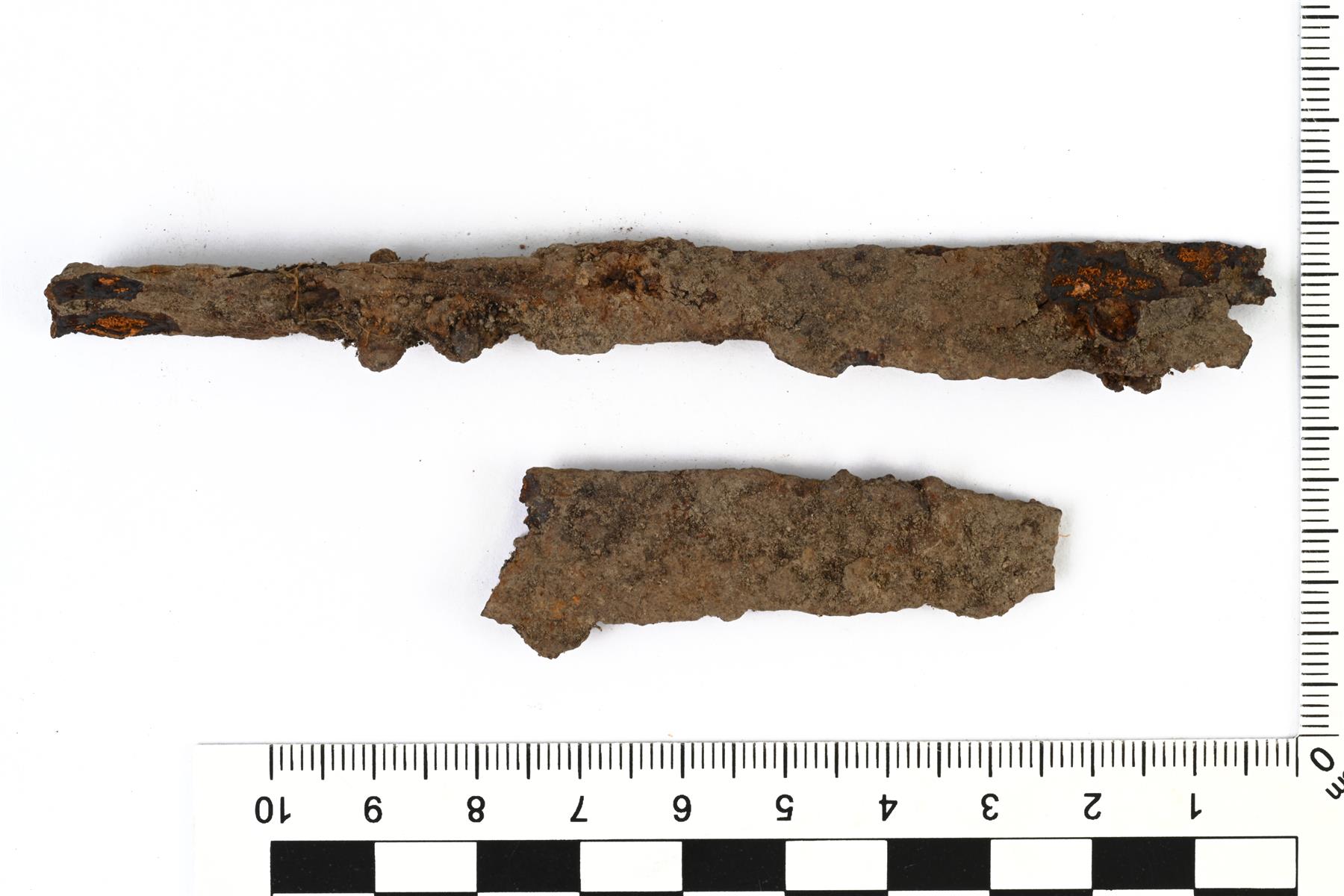 | Kahteen osaan hajonnut pöytäveitsi. Ruoto on poikkeuksellisesti käännetty terään nähden 90 asteen kulmaan. Ruodon yläosassa on kaksi kiinnitysniittiä | |