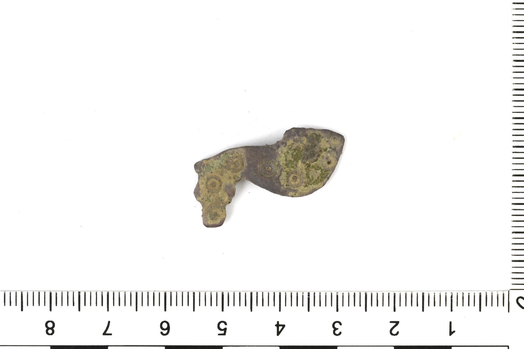 | Mahdollinen eläinriipuksen katkelma. Levymäinen ja koristeltu häränsilmäleimoilla. | |