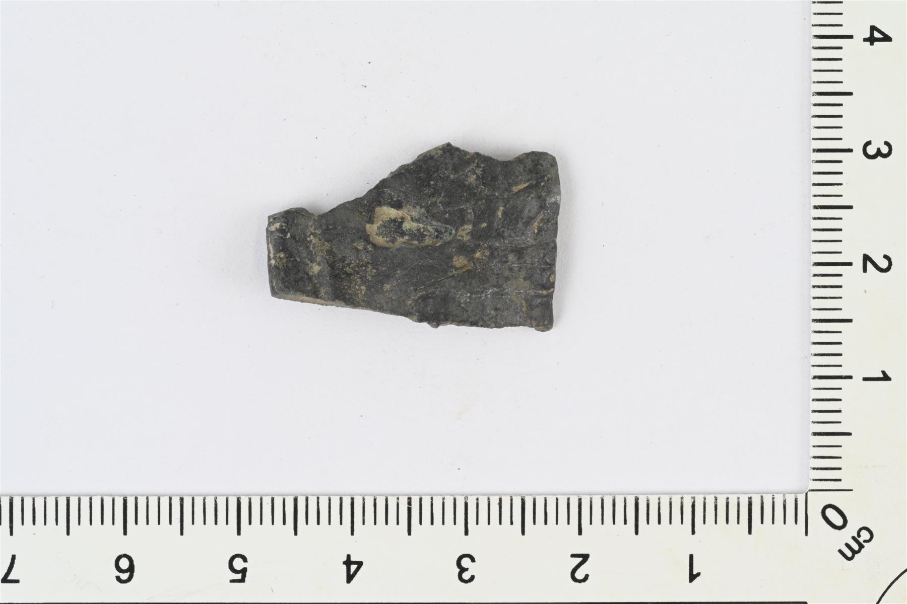 | Todennäköinen soikean kupurasoljen reunakatkelma. Pinnassa koristelun jälkiä. | |