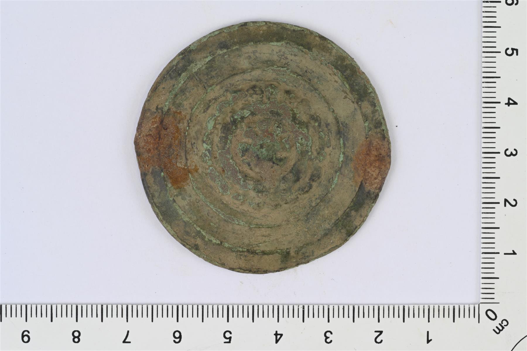 | Luultavasti kuolainten sivukoriste (engl. bridle boss). Voi mahdollisesti olla myös valjaiden hela. Pyöreä, litteä, keskeltä hieman kupera. Vastakkaisissa reunoissa rautaiset niitit. Etupuolella reliefikoristeluna keskellä kukkakuvio, sen ympärillä kaksi helminauhakehää ja niistä ulospäin sileitä kehiä. | |