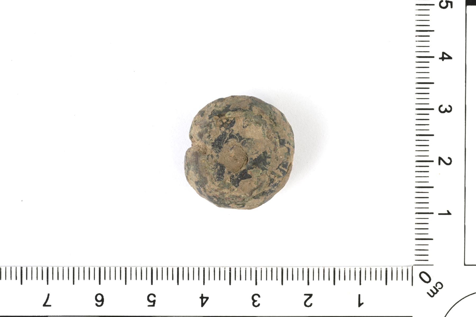 | Kuulamaiselta punnukselta näyttävä kupariseosesine. Keskellä on reikä ja yksi sivu näyttää avoimelta. | |