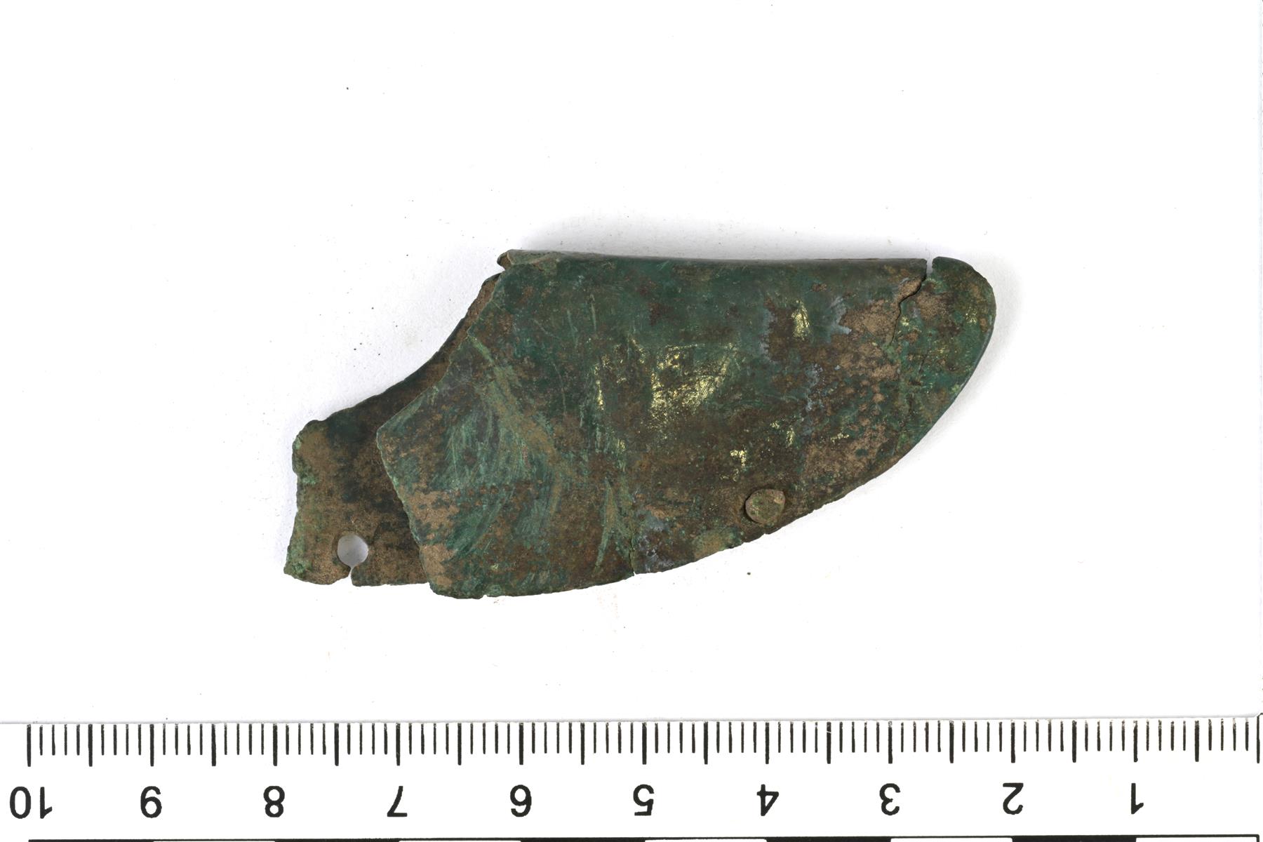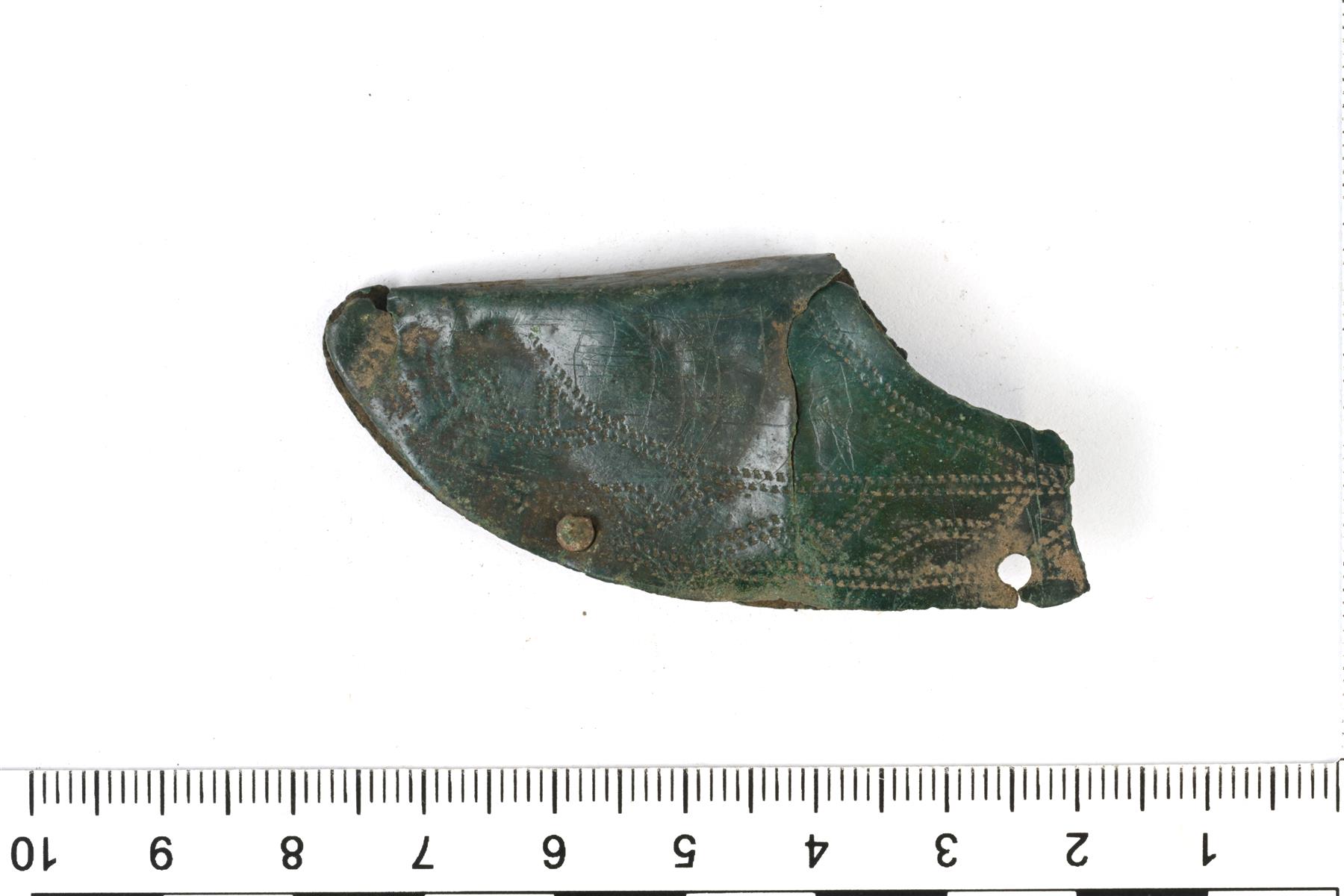 | Ohuesta pellistä taitettu tupen hela. Koristeluna pisteviivoja. Reunalla on niittejä | |