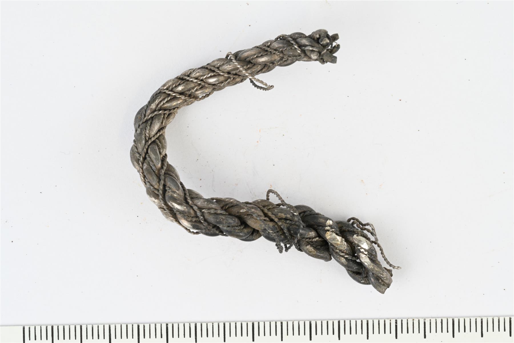 | Pilkkohopeaa. Useista vartaista ja hopealangasta kierretystä rengaskorusta leikattu katkelma. Koostuu 6 paksusta nyöristä, sekä 6 pienemmästä punoksesta, joka koostuu 2 kierretystä hopealangasta. | |