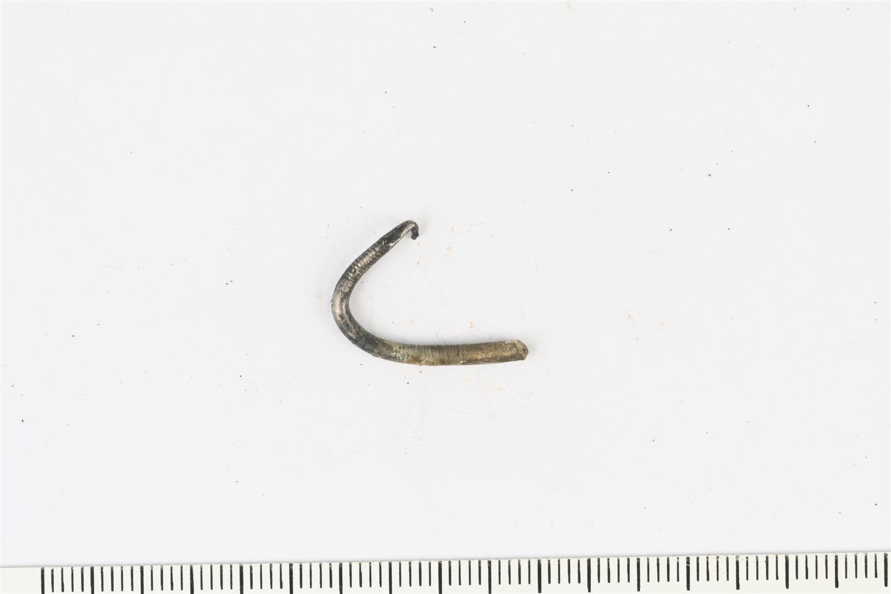 | J:n muotoinen kapean hopeatankon pätkä, jossa kastematomaista uurteita lähes koko pituudeltaan. | |
