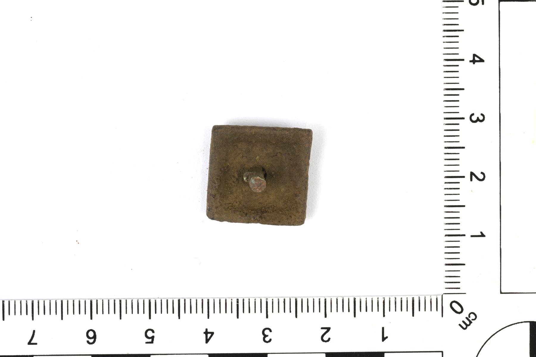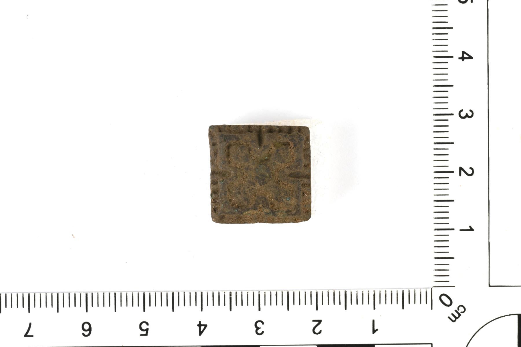 | Neliömäinen ruusukehela. Koristeluna kohokuvioinen vinoristi. Keskellä on reikä ja niitti. | |