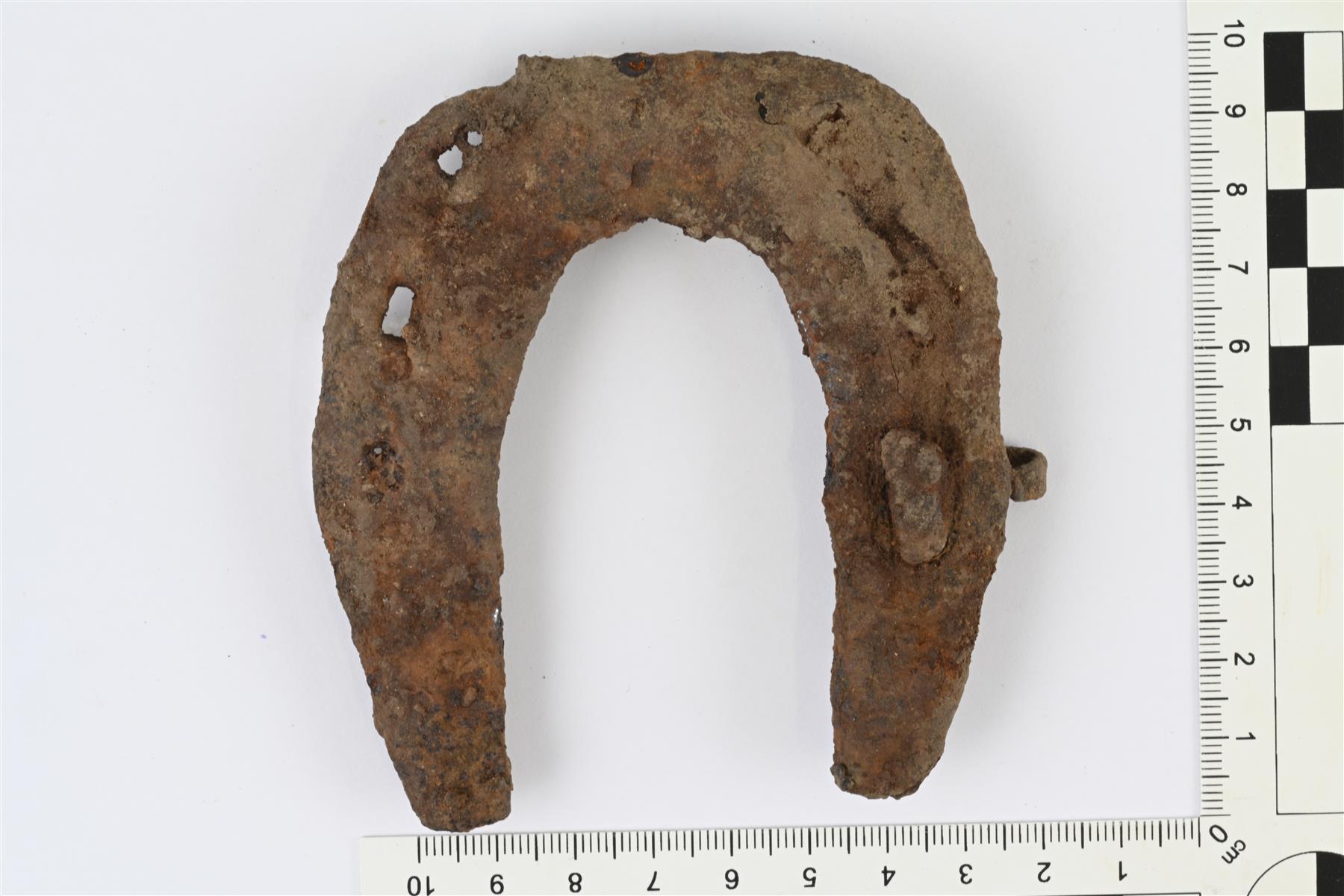 | Pieni aaltoreunainen hevosenkenkä. Kuusi pitkänomaista suorakulmaista naulanreikää, joiden kohdalla kengän ulkoreuna kaartuu ulospäin tehden reunasta aaltomaisen. Yhdessä reiässä jäljellä naula. Päät tasaiset, ei hokkeja. Paksuus mitattu naulan kohdalta, kengän paksuus 6 mm. | |