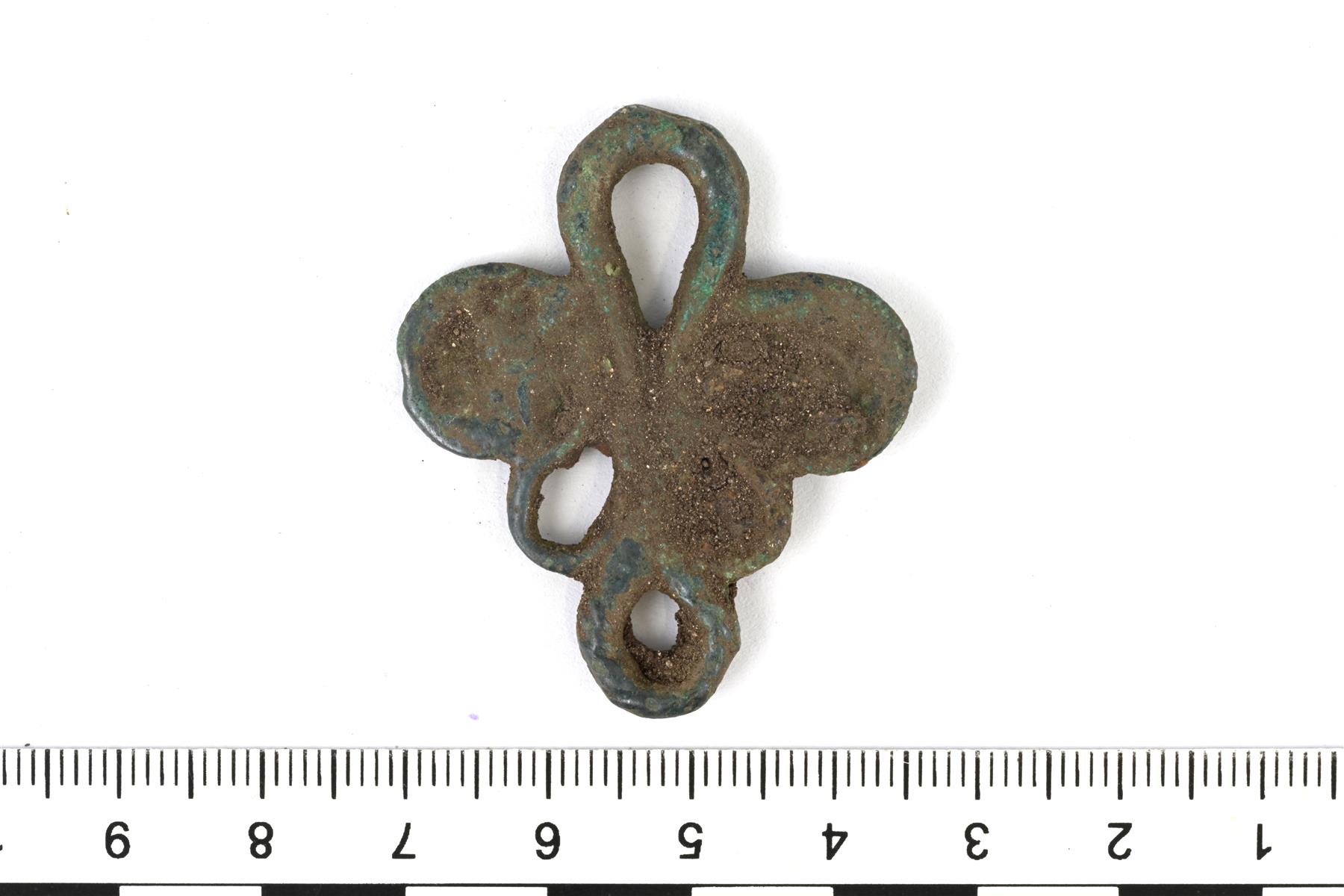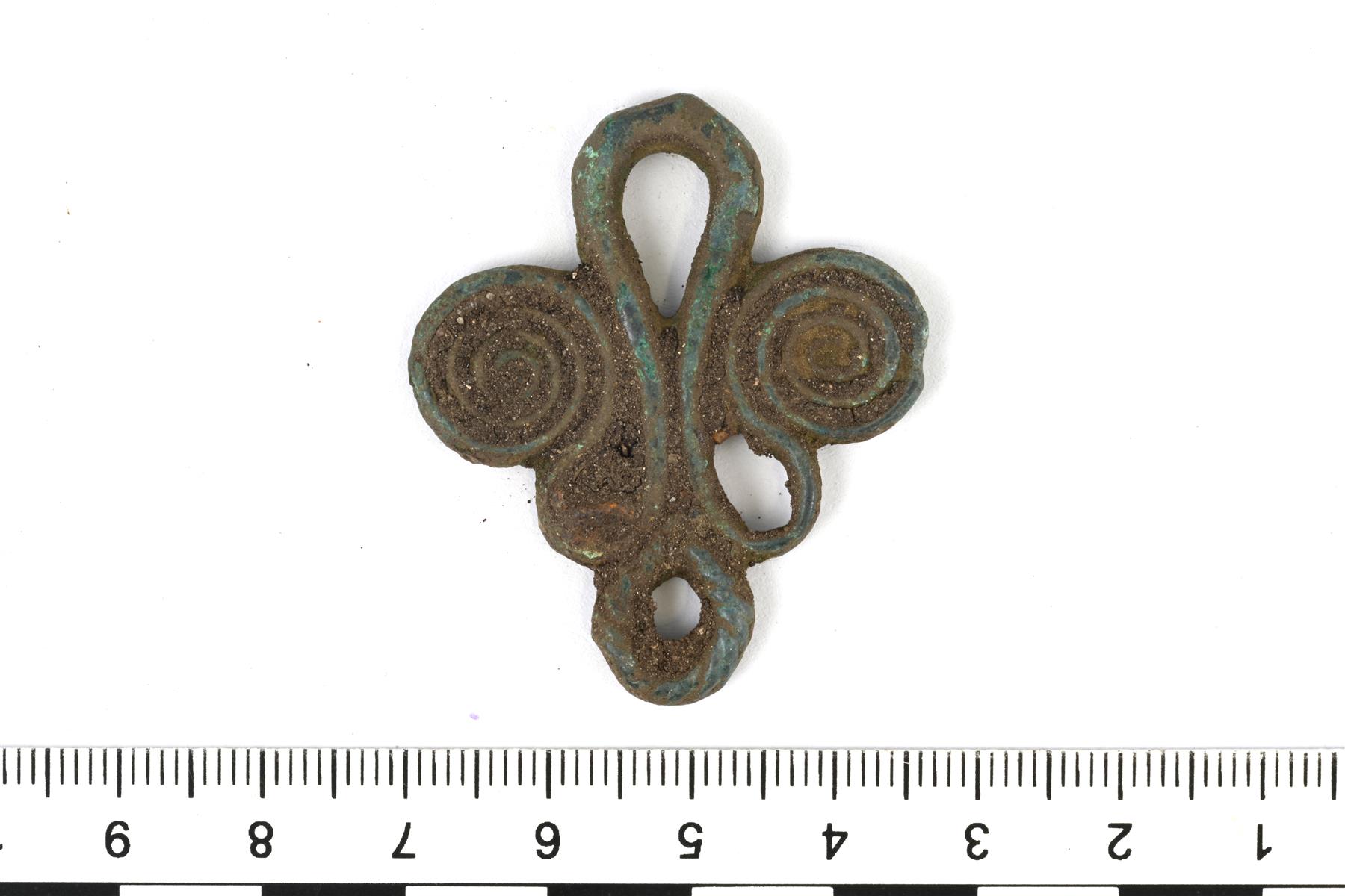 | Spiraalipäinen ketjunkantaja. Yläosassa on yksi lenkki ja alaosassa on kolme. Koristelu on tehty taidokkaasti ja esineen etupuolen ornamentiikka muodostuu nauhakuviosta, joka päättyy sivuilla oleviin spiraaleihin. Alaosan ulkopinnassa erottuu poikittaisia viivauurteita (nyörimäinen koristelu). Vrt. Kivikoski Abb. 767 ja 1110. Vrt. myös merovingiajan metallilangasta tehtyyn ketjunkantajaan Abb. 469. | |