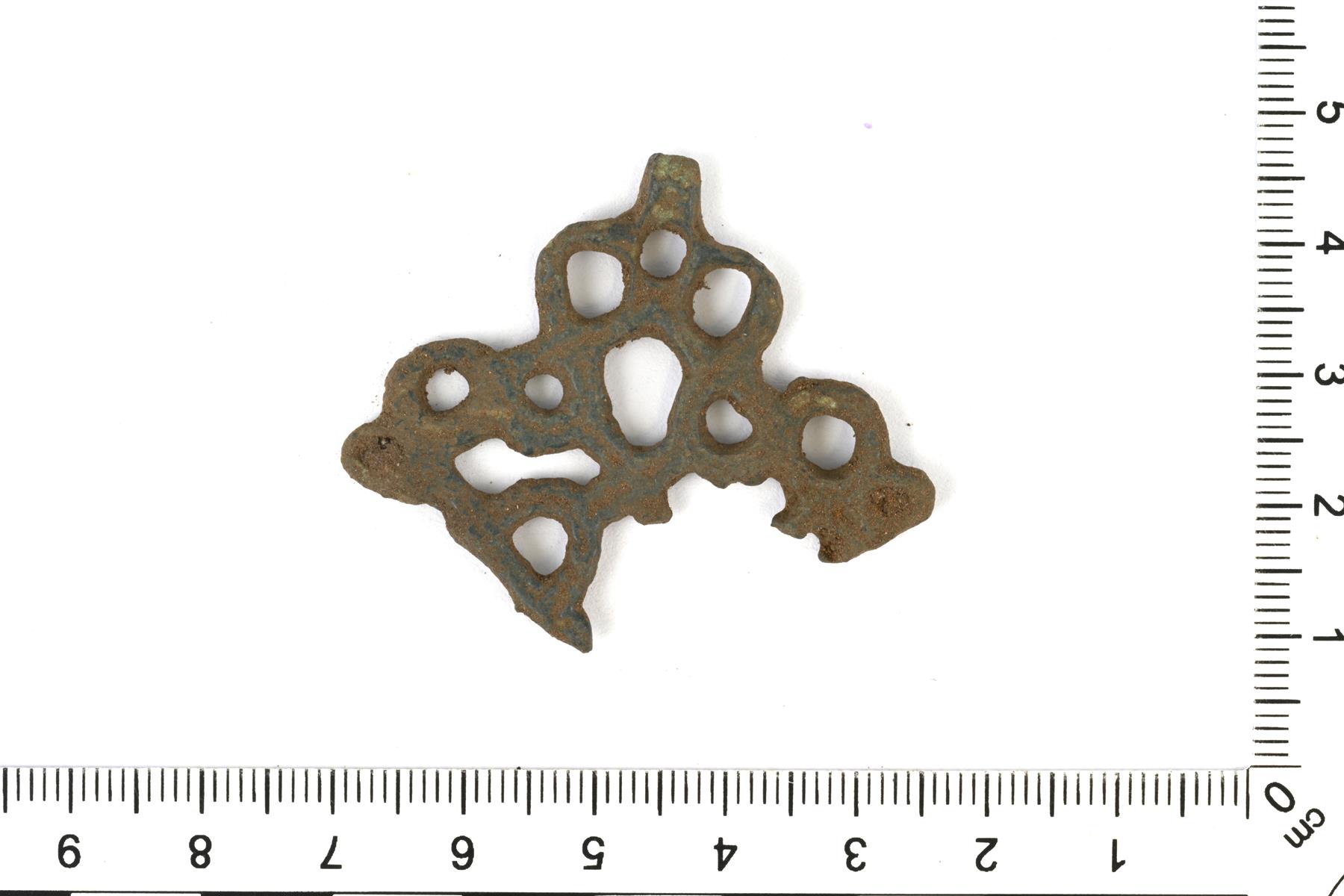 | Ristinmuotoisen ketjunkantajan katkelma. Koristeluna on nauhapunosornamentiikkaa. Vrt. Kivikoski Abb. 1114. | |