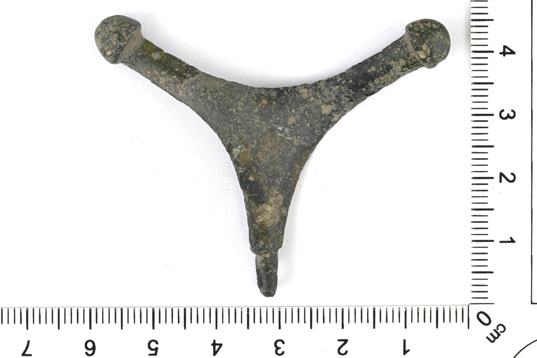 | Kolmioneulan nuppikatkelma. Kolmion yläkulmissa on puolipallomaiset koristeet sekä poikittaisia viivauurteita. Keskellä on kolmiomainen syvennys jonka keskellä on puolipallo. Vrt. Kivikoski Abb. 448 ja 721, Tvauri Fig. 99. | |