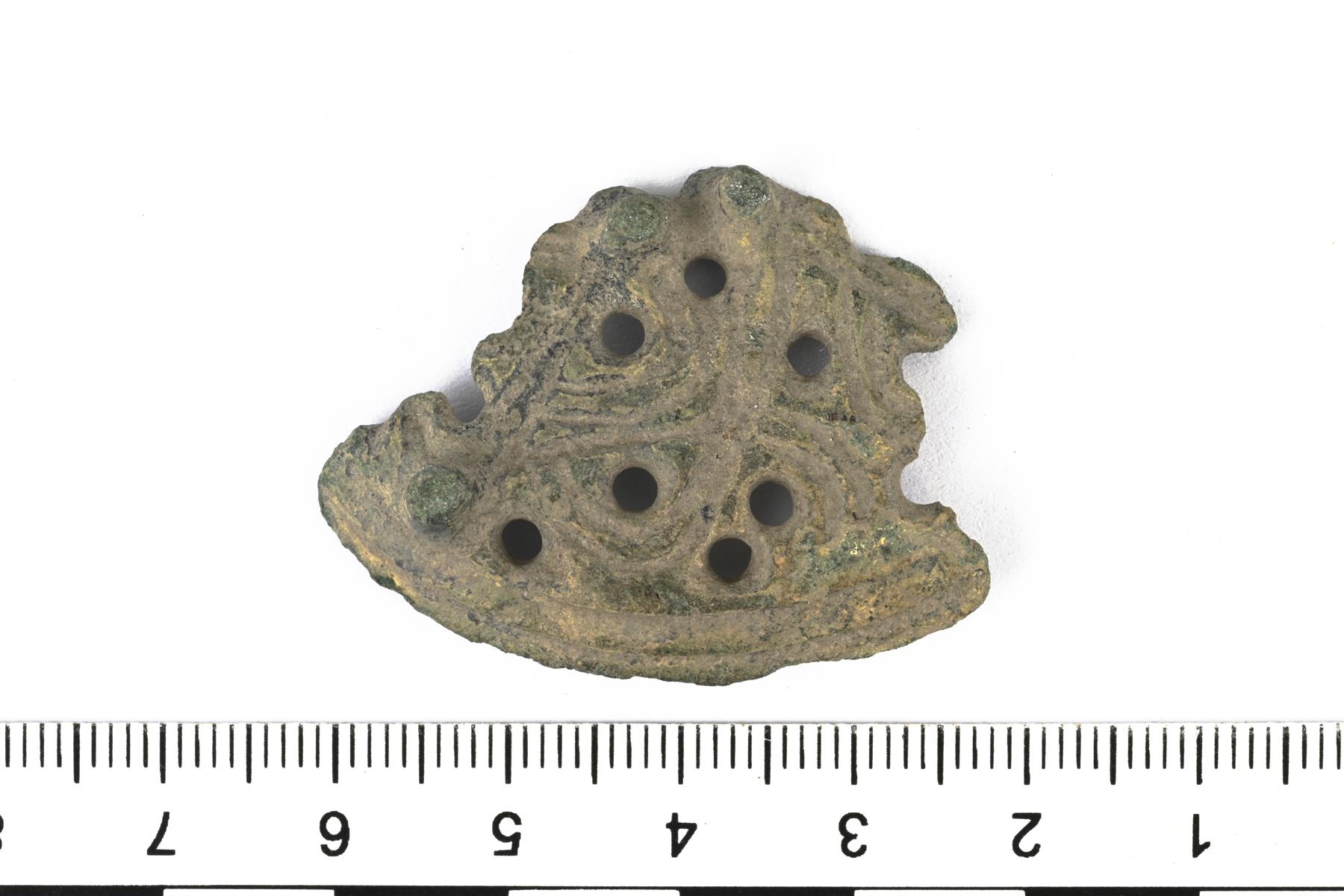 | C/D-tyypin pyöreän kupurasoljen reunakatkelma. Koristeluna tappeja, viivauurteilla tehtyjä nauhakäärmeitä ja reikiä. Taustapuolen neulakota on hajonnut. | |