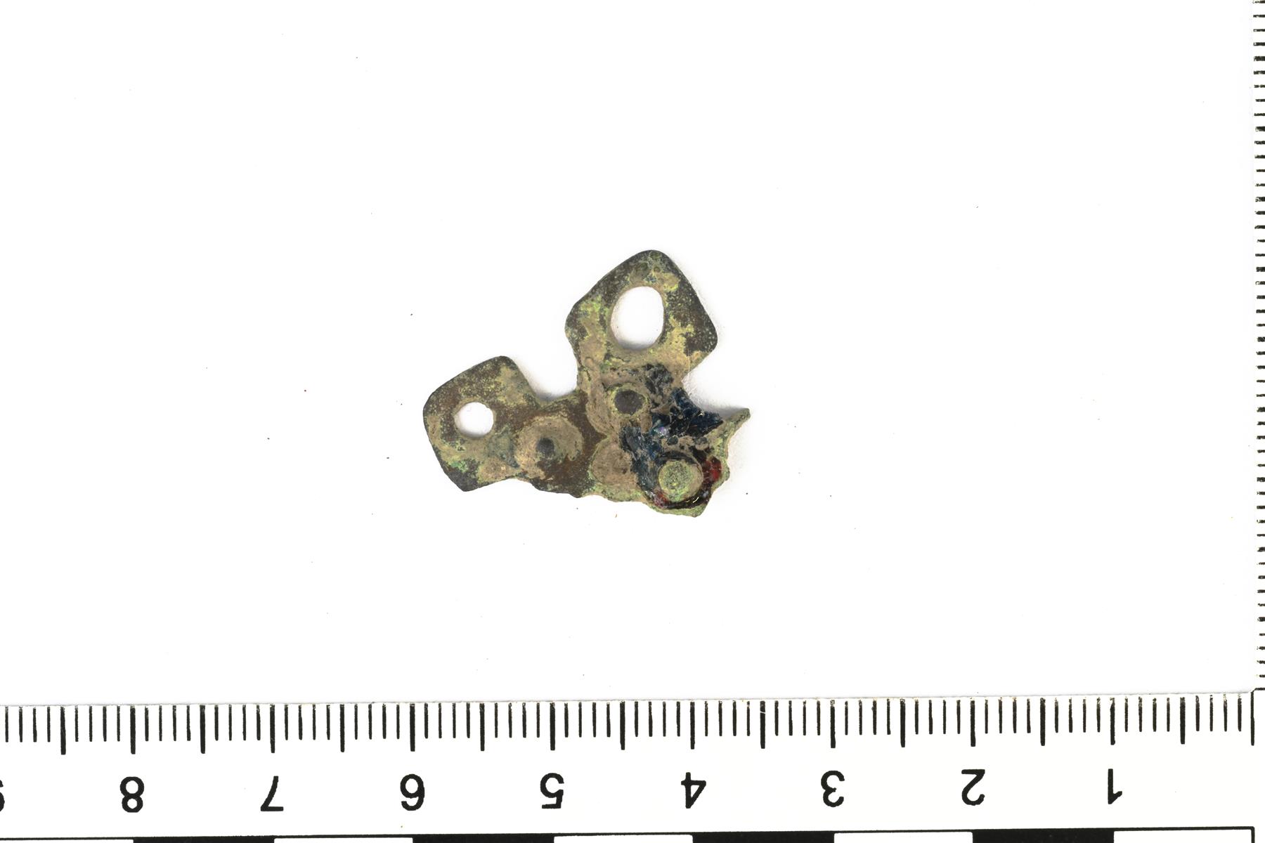 | Tappi- ja reikäkoristeisen ristiriipuksen katkelma. | |