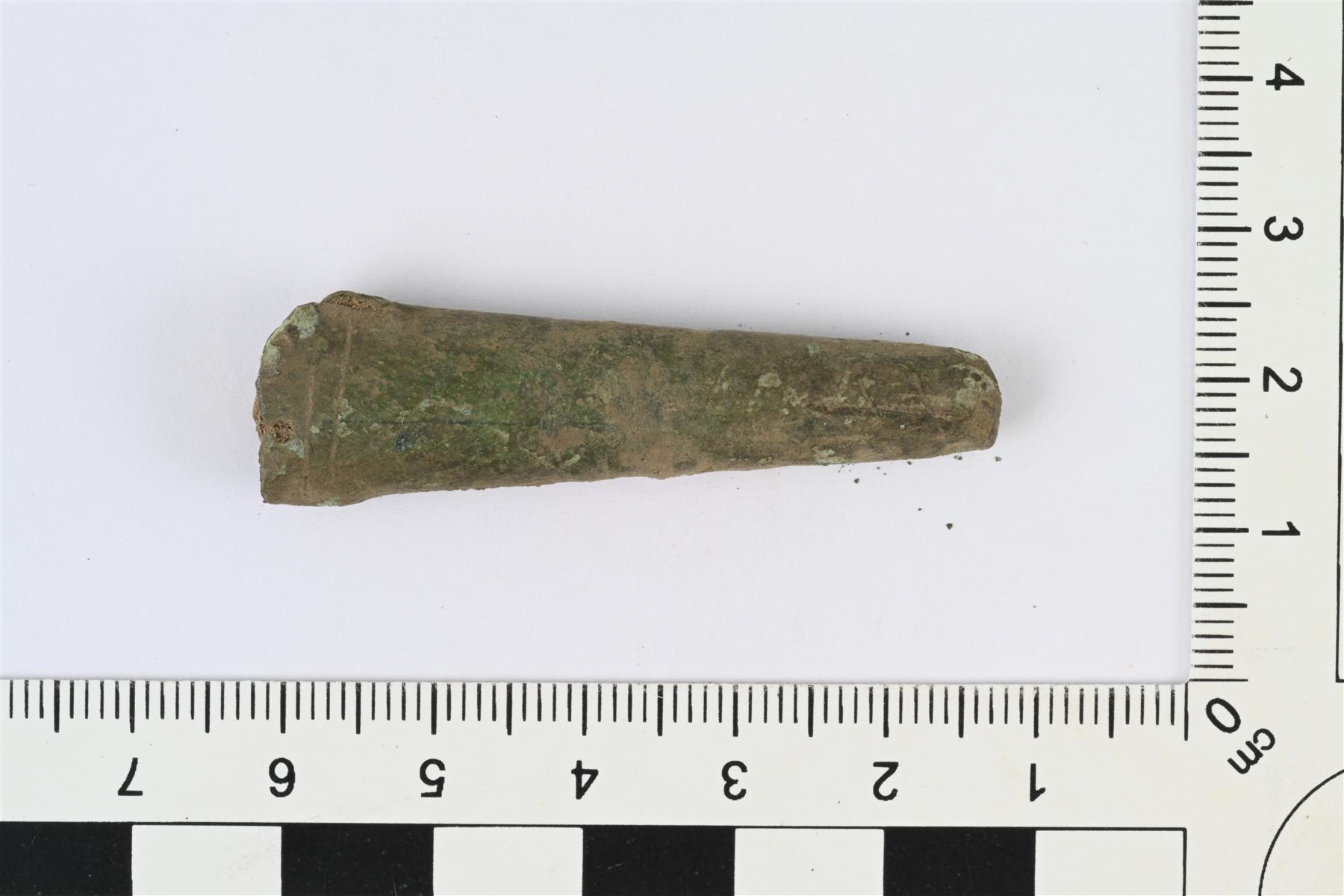 | Putkimainen kupariseosesine, mahdollinen neulakota. Toiseen päähän levenevä, poikkileikkaus leveässä päässä ovaali ja kapeassa päässä pyöreä. Leveässä päässä toisella puolella kaksi poikittaista viivauurretta ja pieni pyöreä reikä. Sisällä maa-ainesta, jonka kanssa punnittu. | |