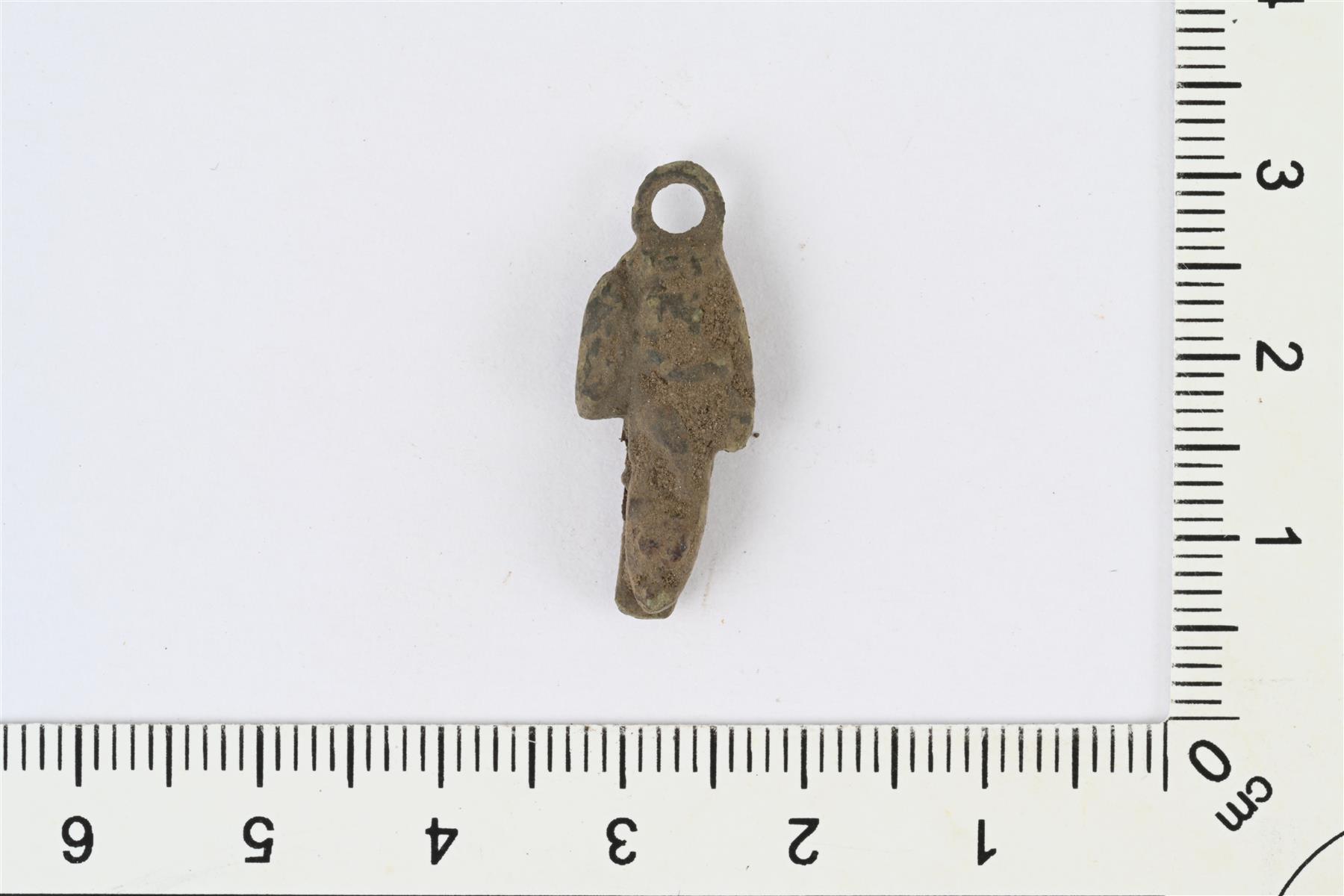 | Pieni kirjansolki. Toisessa päässä lenkki. Etupuoli reliefikoristeinen ja osittain murtunut. Taustapuolella kapeampi litteä varsi. | |