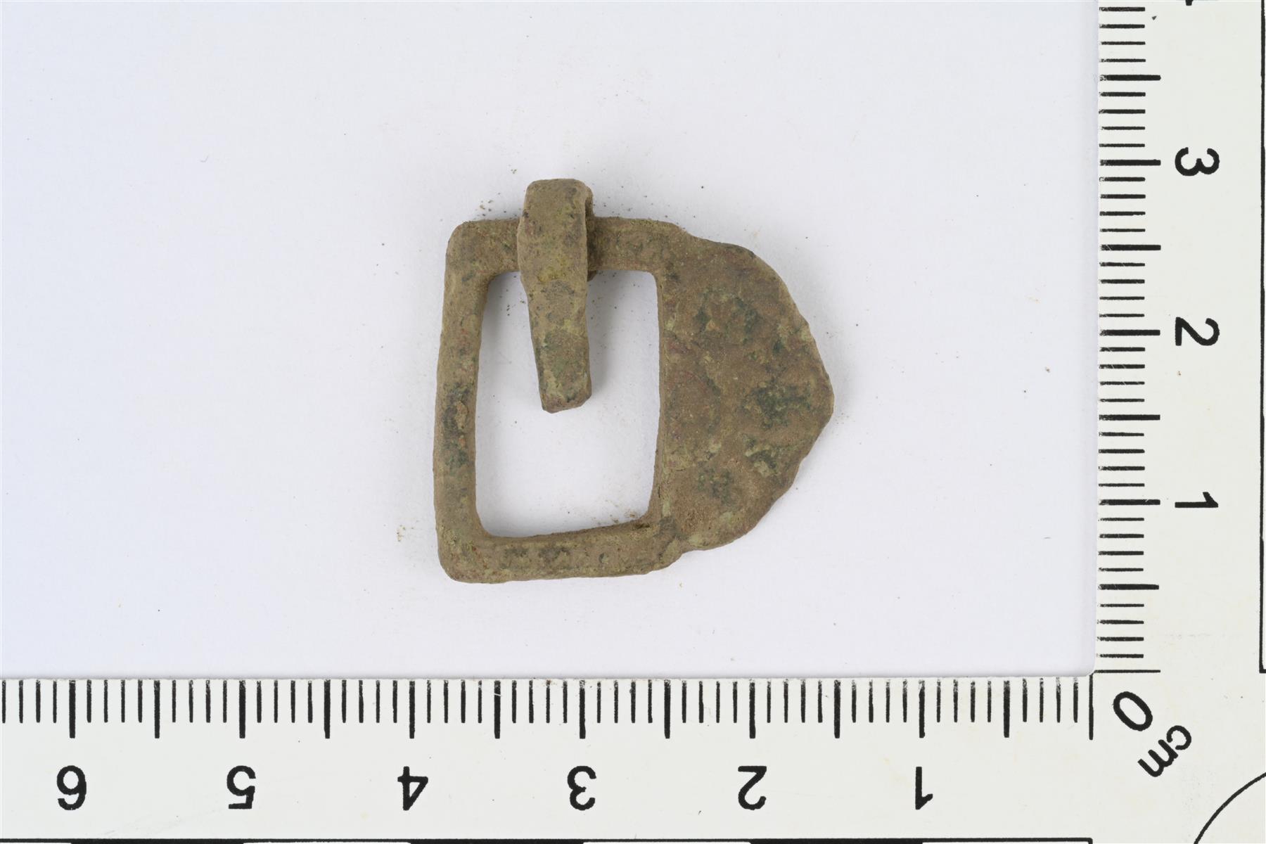 | Vyön- tai hihnansolki. Suorakaiteenmuotoinen kehä, jonka toinen pitkä sivu levenee kolmiomaiseksi. Neula katkennut, tyvi kierretty kehän ympärille. | |