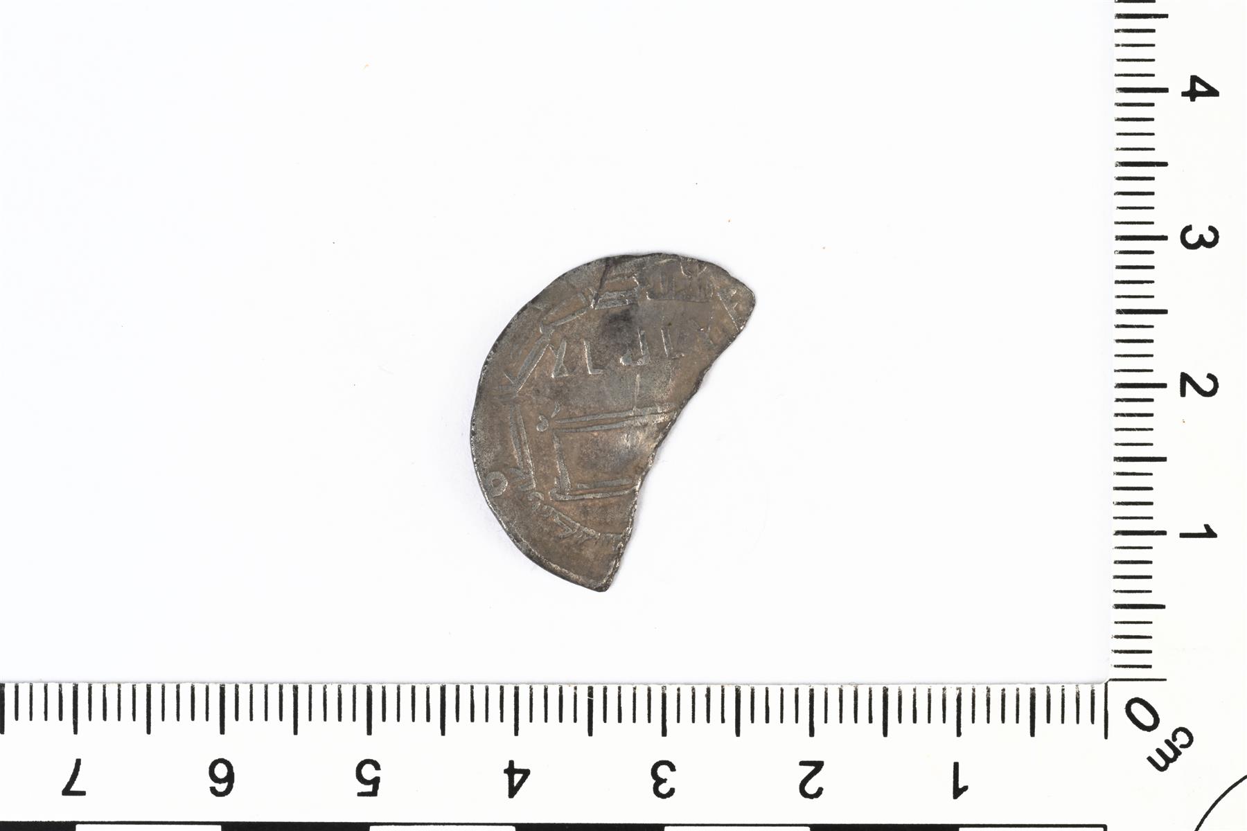 | Abbasidit, todennäköisesti al-Mahdi, dirhemi AH 158-169 (775-785 jaa). Leikattu n. 2/3. | |