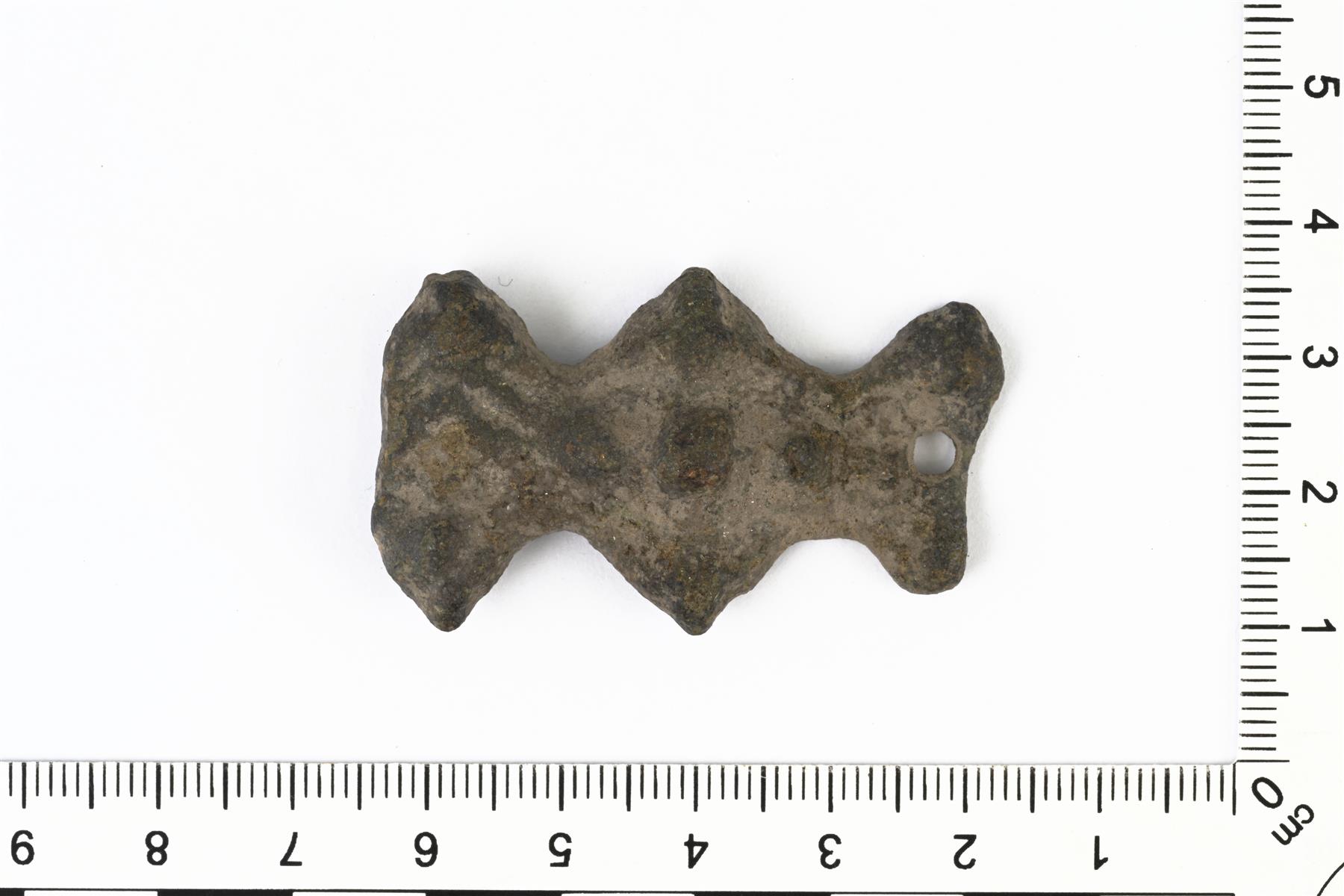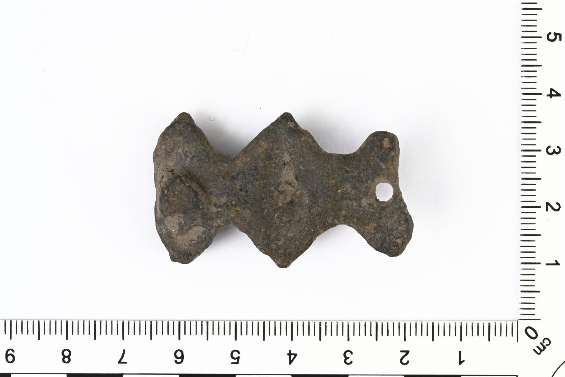 | Tasavartisen soljen katkelma. Kumpikin pääty on hajonnut ja esine on korjattu tekemällä toiseen päähän reikä neulaa varten. Vastapään taustapuolella on neulakota. Pinta on kulunut, mutta siinä on säilynyt tappien tyviosat ja viivauurrekuviointia. Vrt. Kivikoski Fig. 15. | |