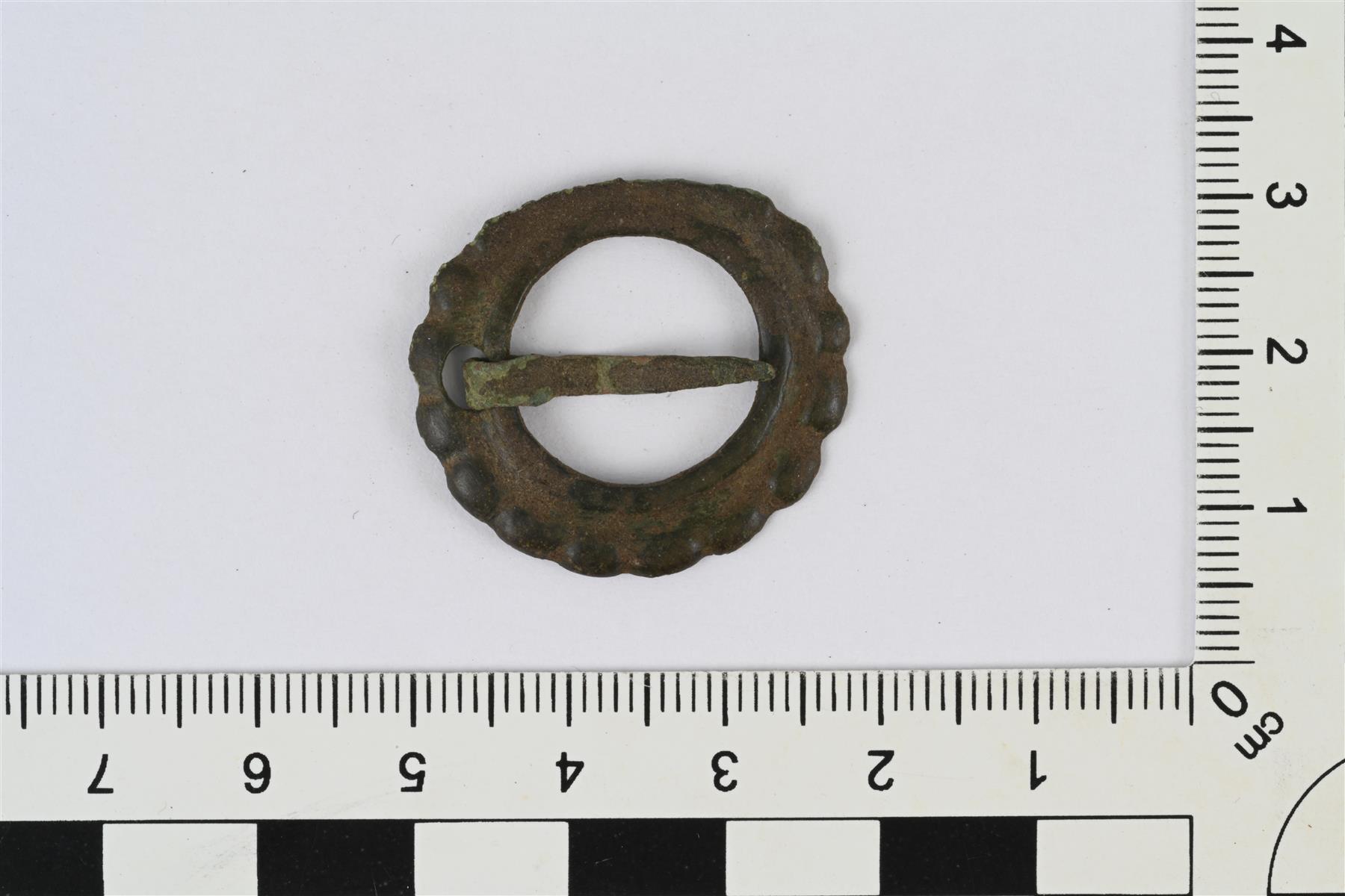 | Pyöreä kehäsolki. Litteä kehä, jonka ulkoreuna aaltomainen ja siinä kohopalloja, sisäreunassa sileä kohovyö. Kehässä reikä, johon neulan tyvi kierretty. Kehän reuna osittain murtunut. | |