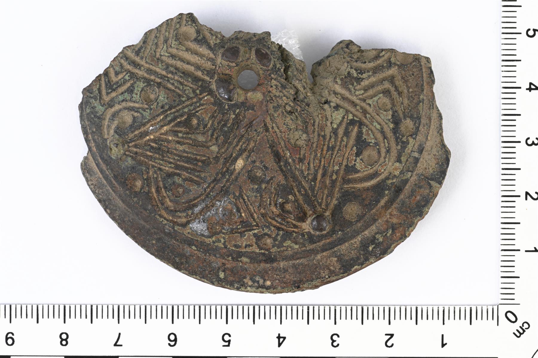 | D-tyypin pyöreän kupurasoljen puolikas. Koristeluna tappeja, pyöreitä kuoppia sekä viivauurteilla tehtyjä nauhakäärmeitä ja ristikuvio. Reunus on leveä. Taustapuolella on neulan kiinnityslenkki. | |