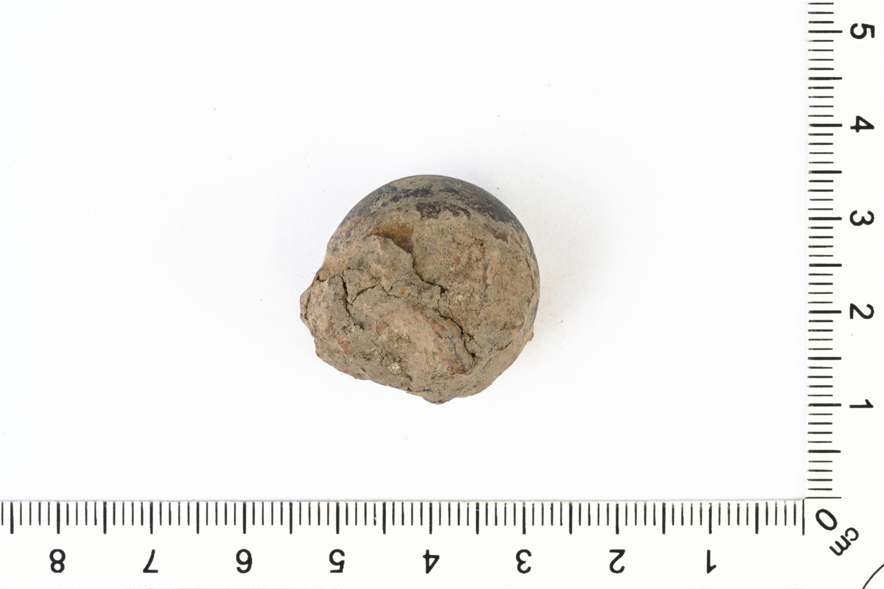 | Navoilta viistetty kuulamainen punnus. Rautaisen ytimen korroosio peittää osaa ulkopinnasta. | |