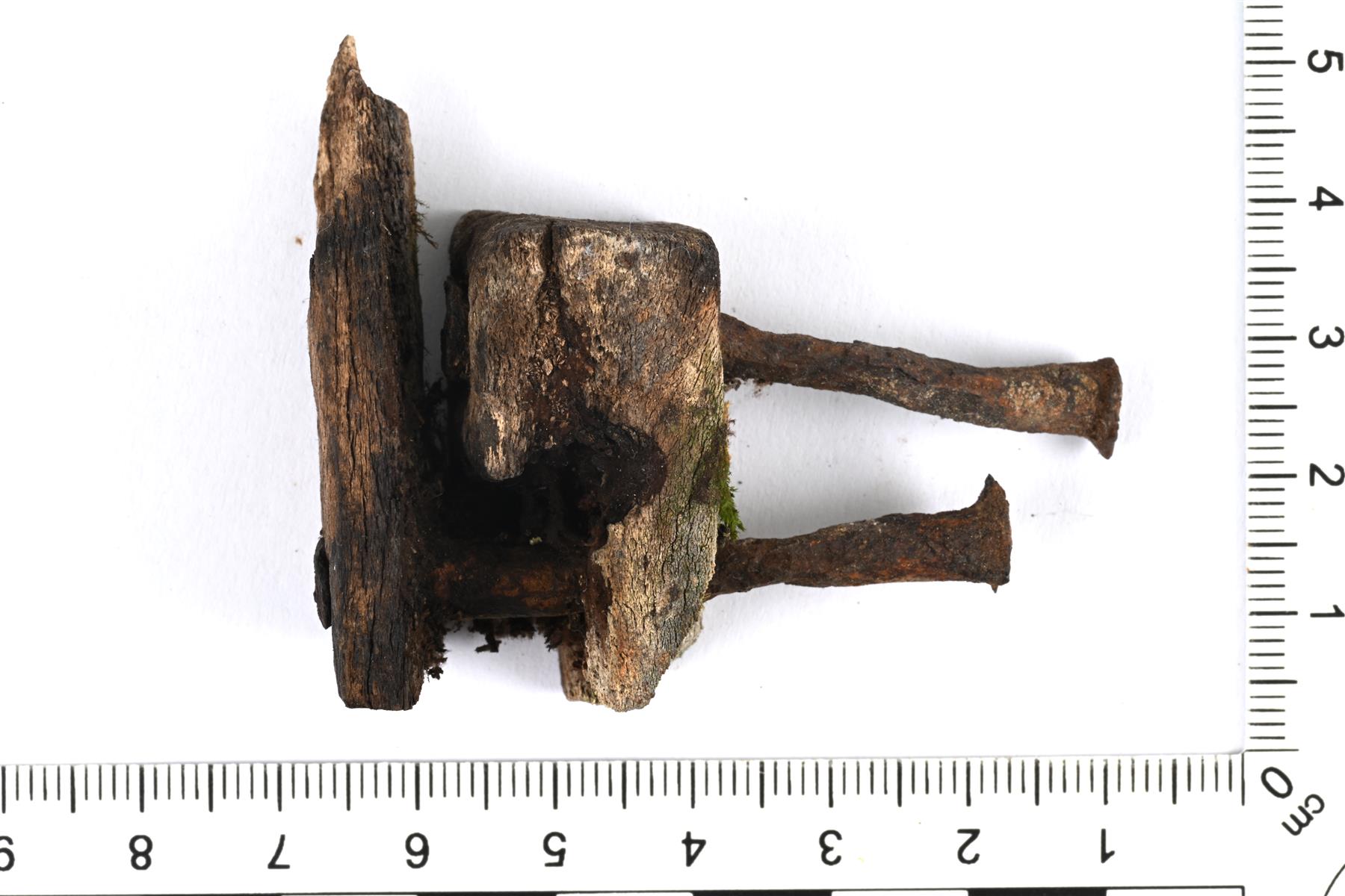 | Kahdesta luusta tehty varsijousen osa. Kiinnityksenä kaksi niittiä. | |