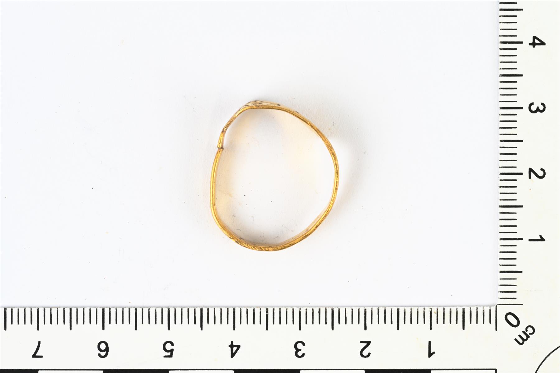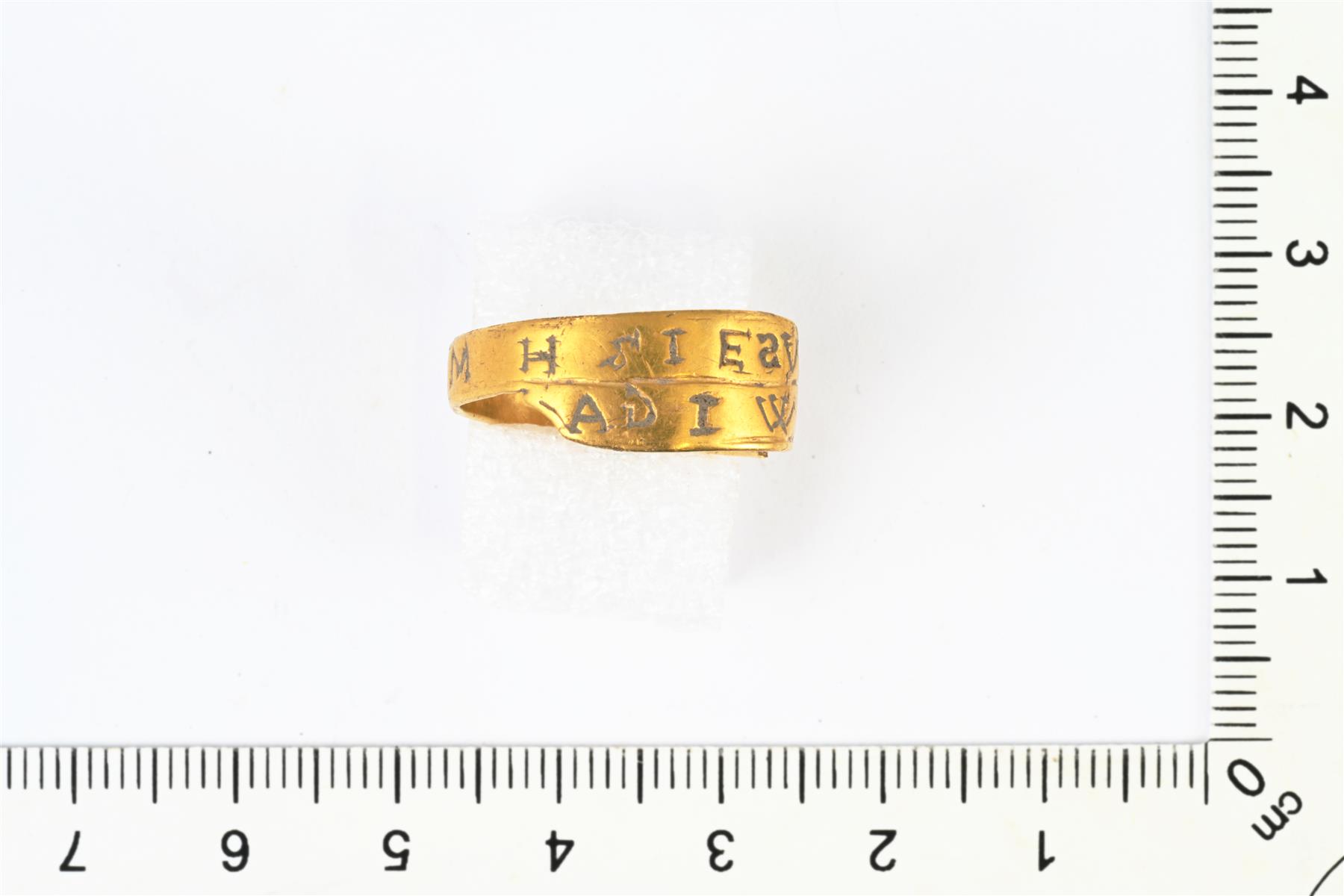 | Kultainen umpisormus. Tehty ohuesta levystä. Kehää kiertää kirjoitusta: AD I W D WWV * W I M H S I E 2 V | |
