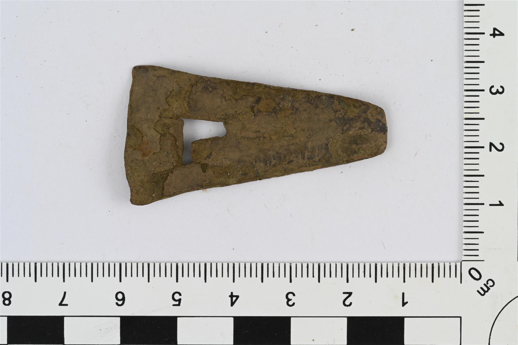 | Mahdollinen hela. Venytetyn ja kärjestä katkaistun kolmion muotoinen levy, jossa kulmikas reikä. | |