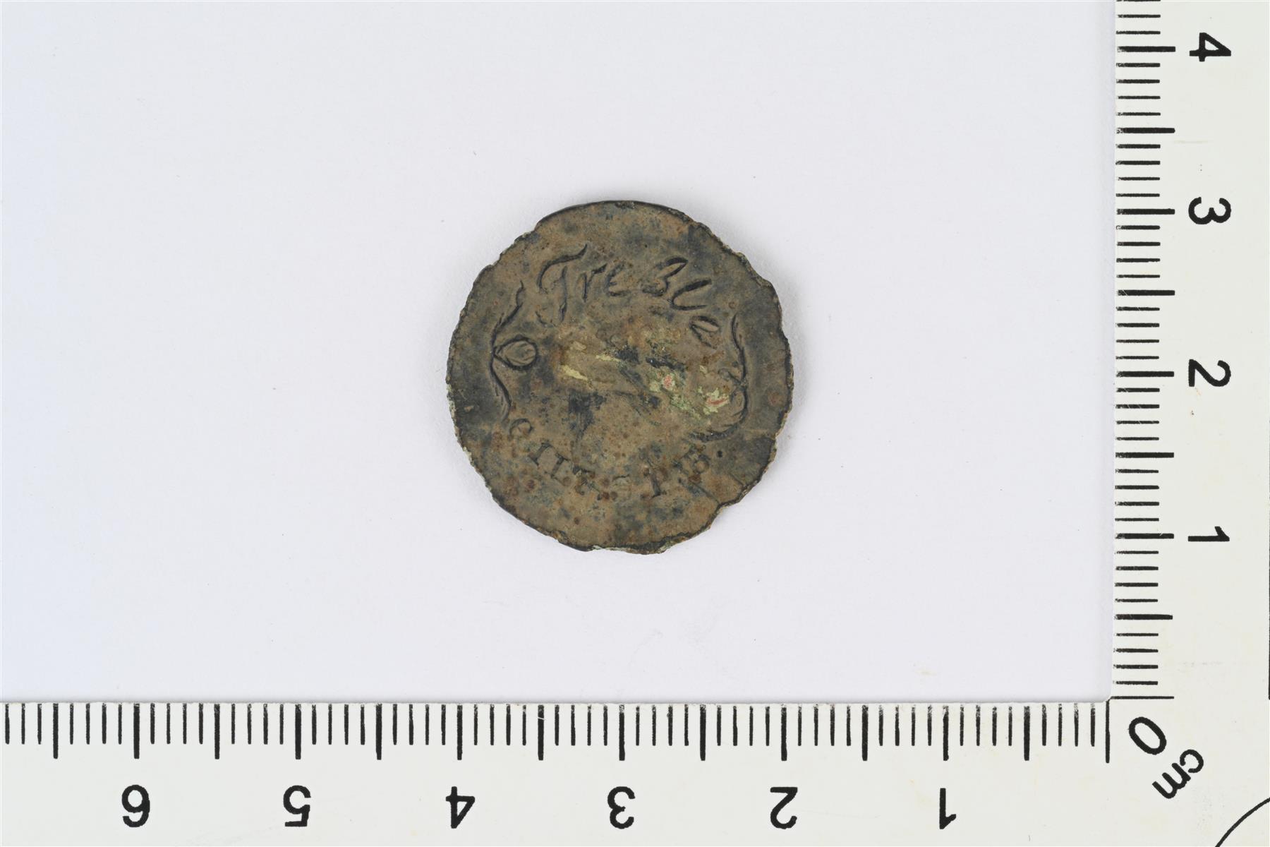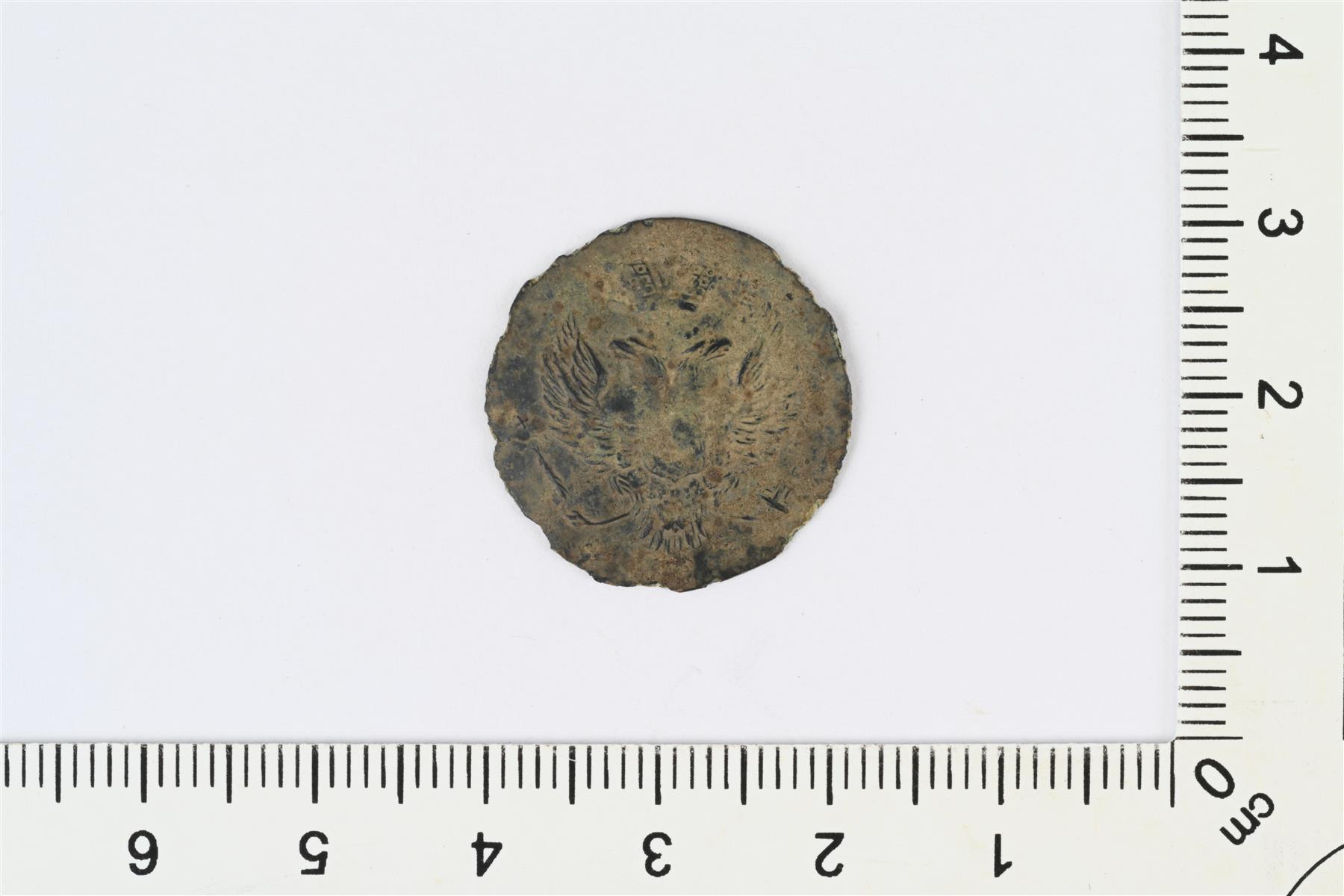 | Ohut kupera nappi. Etupuolella reliefinä kaksipäinen kotka. Taustapuolella tekstiä, mahdollisesti GILT S.P. ... ja kaunokirjoituksella Treble. Taustapuolelta katkennut kanta. | |