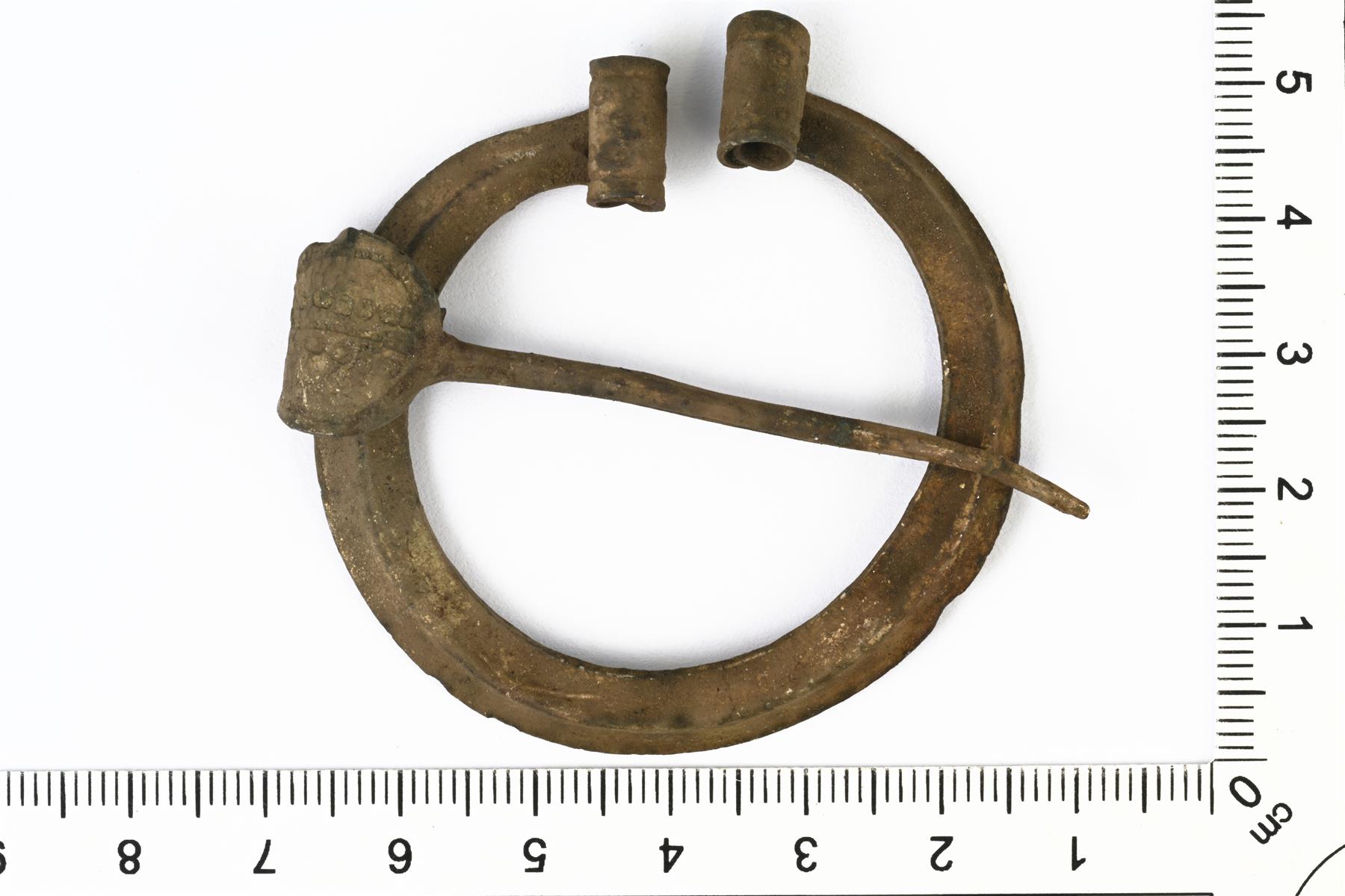 | Pienikokoinen hevosenkenkäsolki. Kehän poikkileikkaus on litteä kolmio, yläsivut ovat koverat. Päädyt on taottu ohuiksi levyiksi ja kierretty rullanmuotoisiksi nupeiksi. Neulan kanta on ohut levy, joka on kierretty kehän ympärille. Nupeissa ja neulan kannassa on koristeluna viivoja ja häränsilmäleimoja. Vrt. Kivikoski Abb. 692. | |