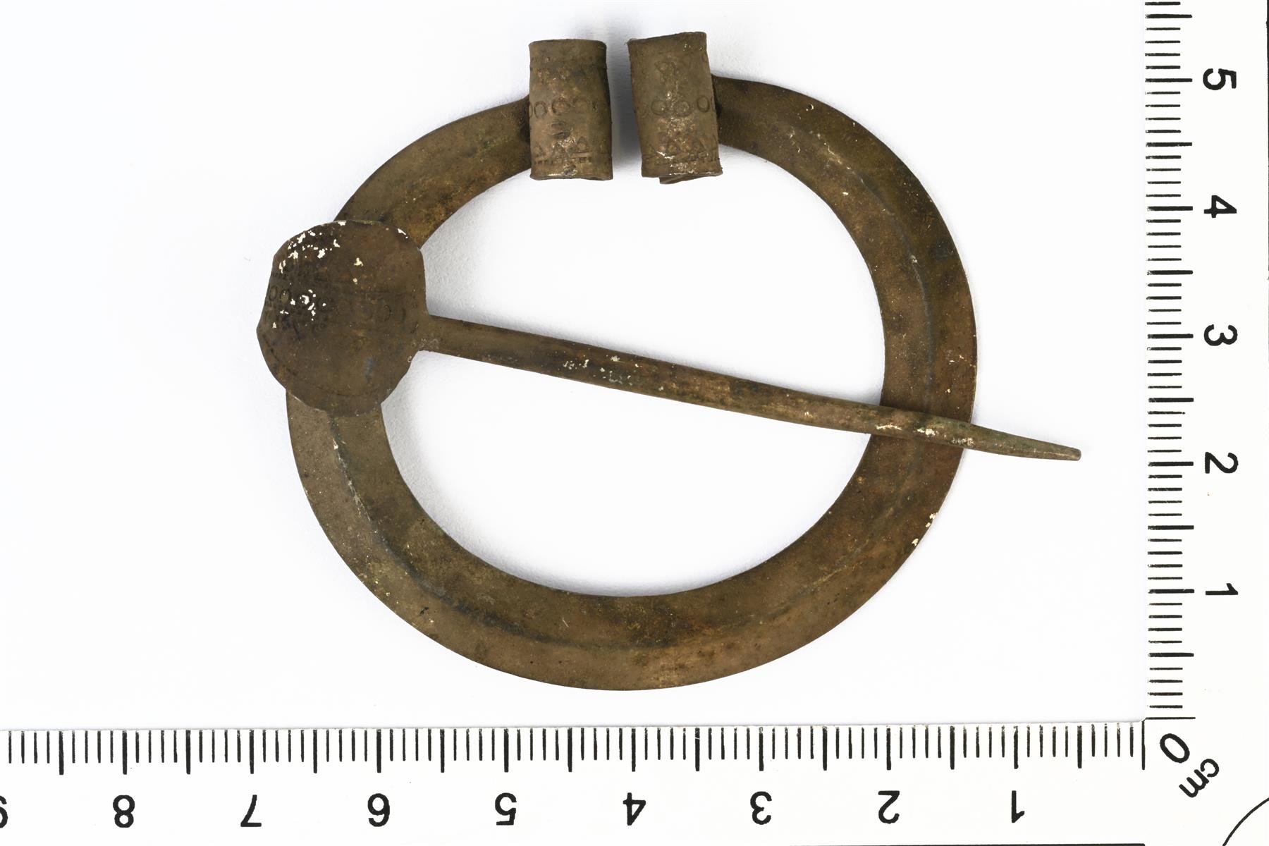 | Pienikokoinen hevosenkenkäsolki. Kehän poikkileikkaus on litteä kolmio, yläsivut ovat koverat. Päädyt on taottu ohuiksi levyiksi ja kierretty rullanmuotoisiksi nupeiksi. Neulan kanta on ohut levy, joka on kierretty kehän ympärille. Nupeissa ja neulan kannassa on koristeluna viivoja ja häränsilmäleimoja. Vrt. Kivikoski Abb. 692. | |
