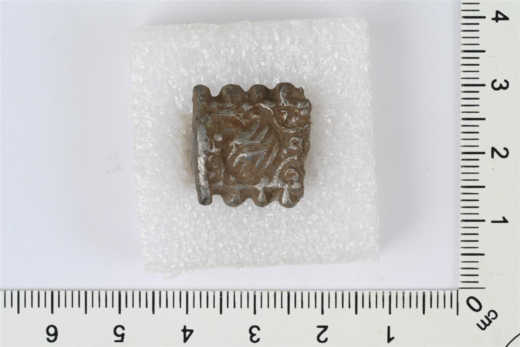 | Vyön- tai hihnanhelan katkelma. Suorakaiteenmuotoinen hela, jonka toinen pää murtunut. Pitkät sivut piparkakkureunaiset, etupuolella reliefikoristelua. Taustapuolella jäljellä yksi kiinnitystappi. | |