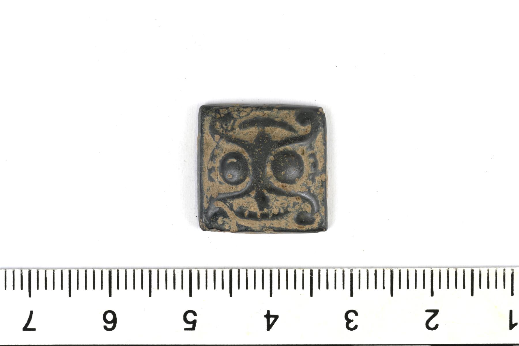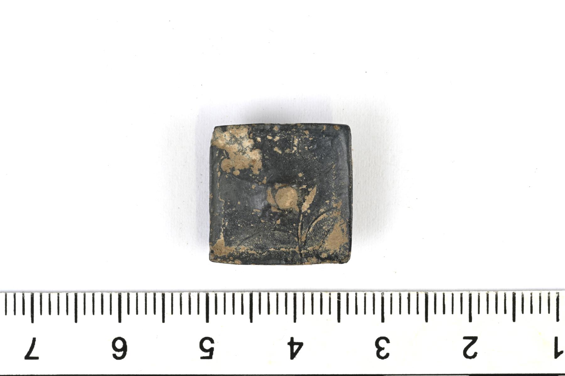 | Neliömäinen vyönhela. Etupinta on kupera ja koristeltu kohokuvioisella kasviornamentiikalla. Ruusukehelan variantti. Taustapuolen niitinvarsi on hajonnut. | |