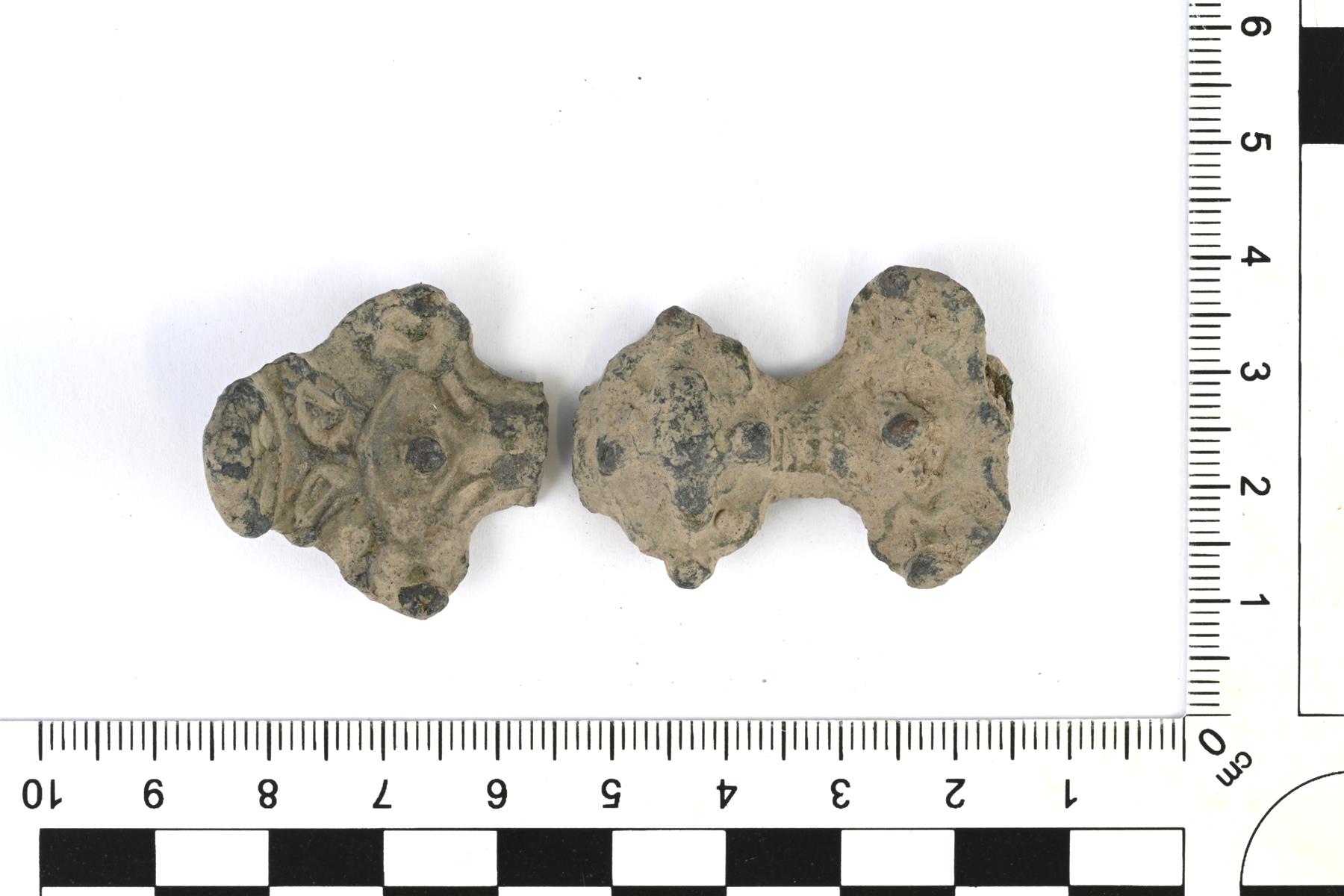 | Kaksi tasavarsisoljen katkelmaa. Säilyneenä yksi pääty sekä keskiosan ja vastakkaisen päädyn jäänne. Koristeluna tappeja ja viivauurrekuviointia. Päätykatkelman taustapuolella on kaksi neulan kiinnityslenkkiä sekä ketjun kiinntyslenkin jäänne. Toisessa katkelmassa on säilyneenä neulakota. Kuuluu Kivikosken tyyppiin 7. | |