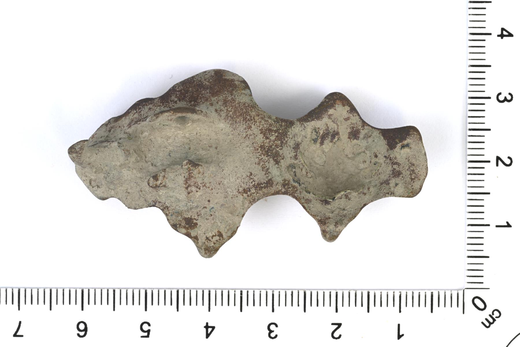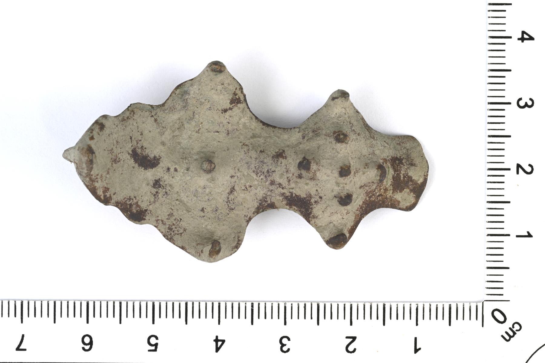 | Toisesta päädystä hajonnut tasavarsisolki. Pinta on melko kulunut ja koristelusta erottuu lähinnä tappeja. Taustapuolella on kaksi neulan kiinnityslenkkiä, joista toinen on hajonnut. Lisäksi päädyssä on hajonnut ketjun ripustuslenkki. | |